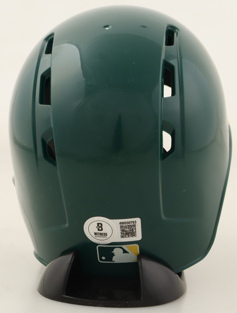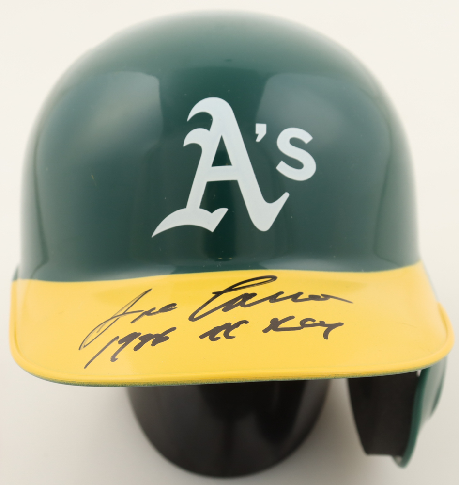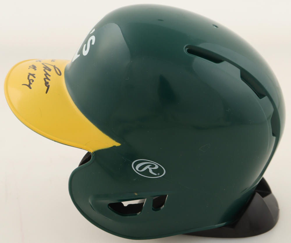 Rawlings Oakland Athletics mini batting helmet. Hand-signed and inscribed by Jose Canseco.