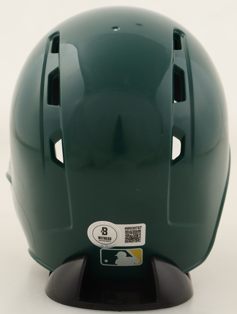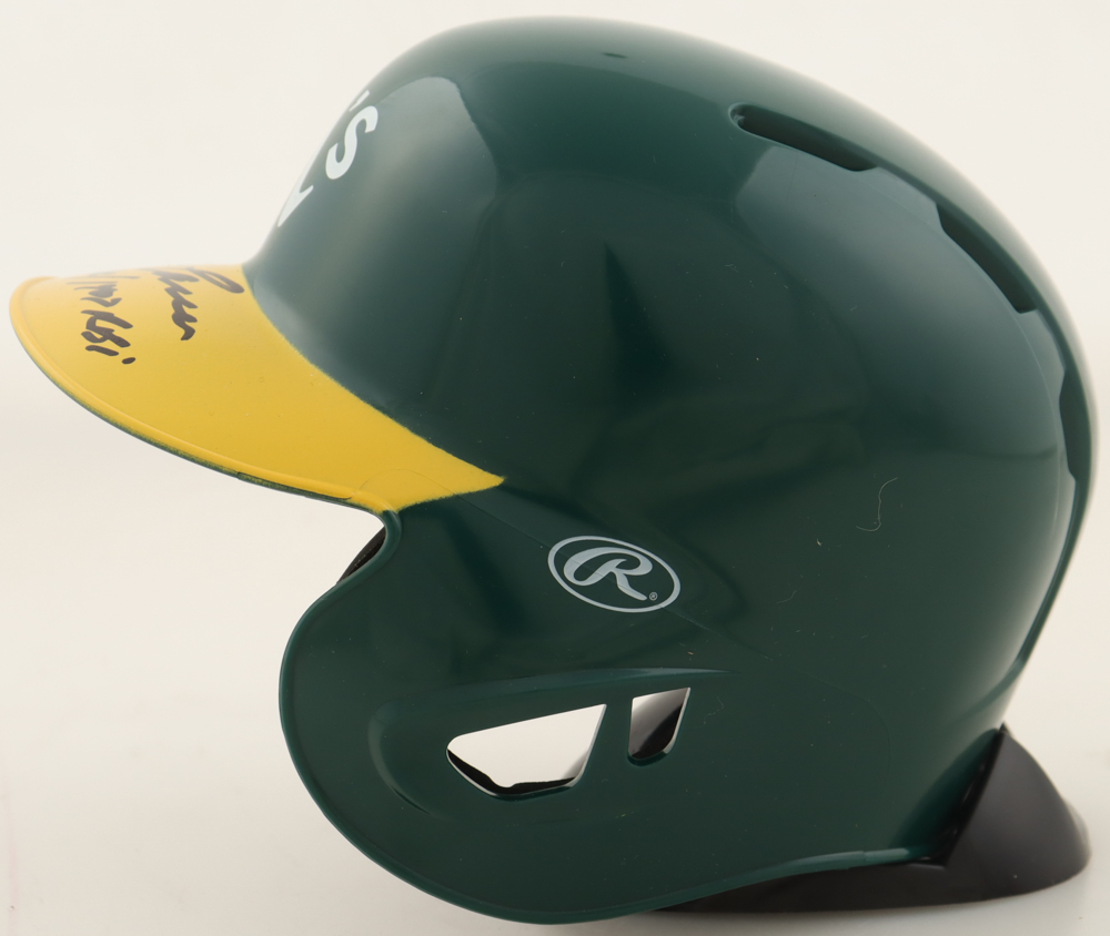 Rawlings Oakland Athletics mini batting helmet. Hand-signed and inscribed by Jose Canseco.