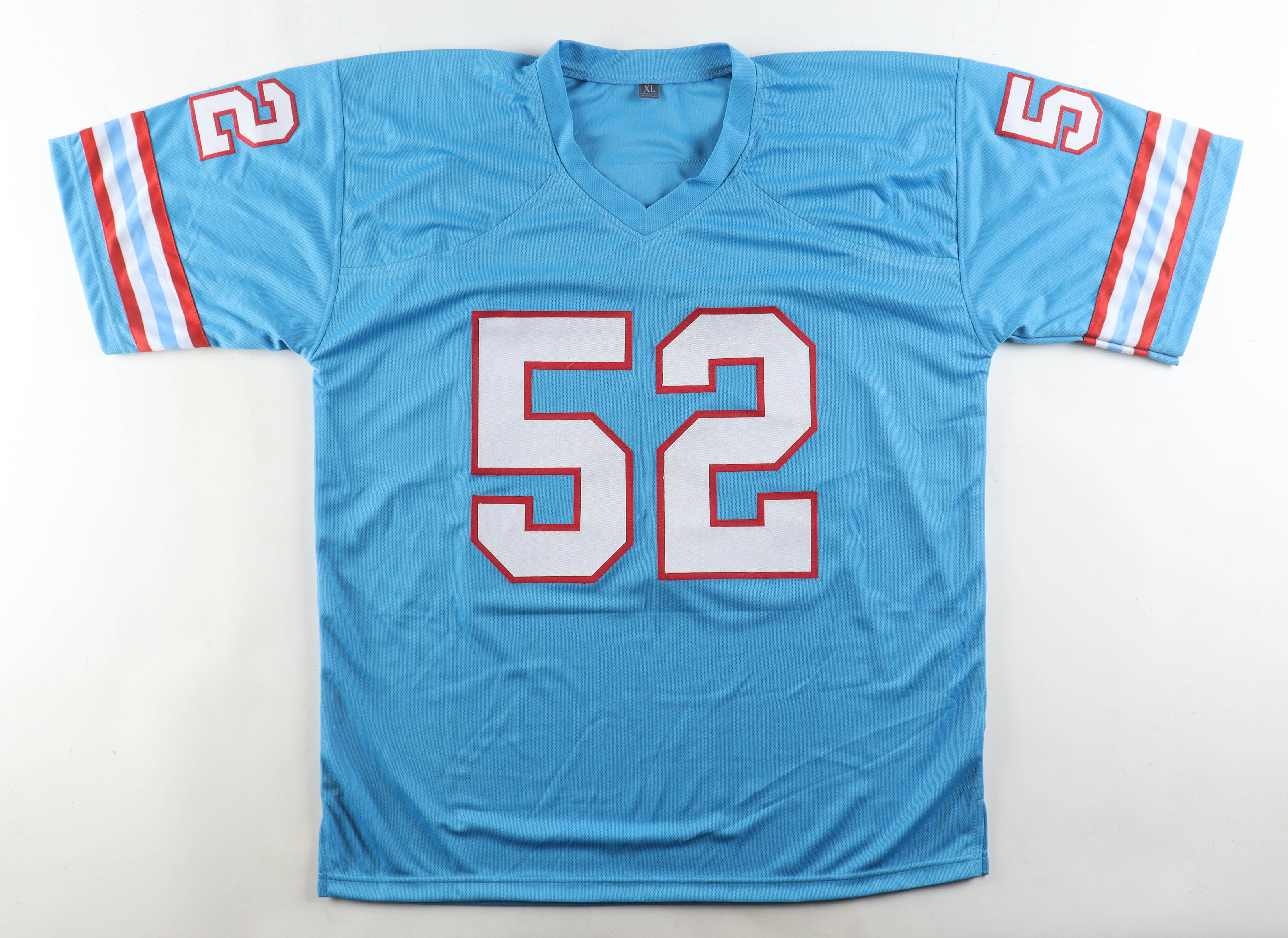 Custom jersey with everything sewn on, size XL. Hand-signed and inscribed by Robert Brazile (HOF).