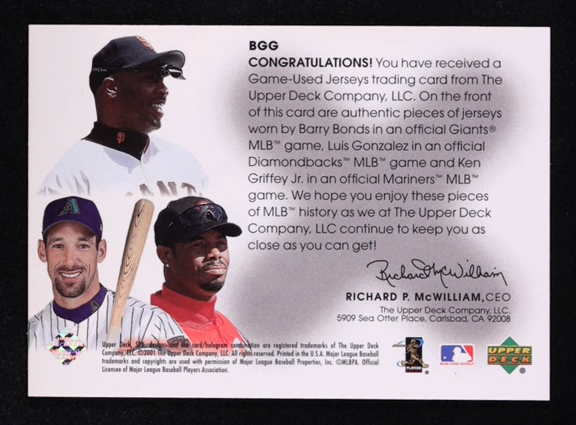 Barry Bonds / Luis Gonzalez / Ken Griffey Jr. 2001 SPx Winning Materials Update Trios #BGG