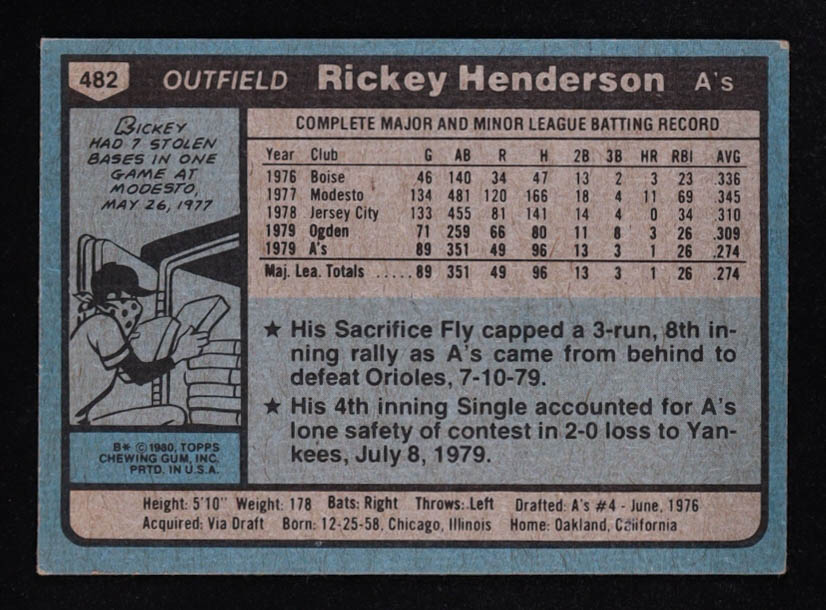 Rickey Henderson 1980 Topps #482 RC (UER)