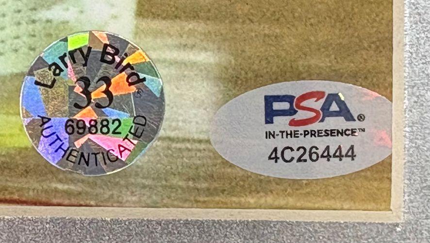 The autograph includes an official PSA/DNA hologram, an official Beckett Authentication Services serially numbered hologram, and an official Larry Bird player hologram for authenticity purposes. The signing of this item was witnessed by PSA.