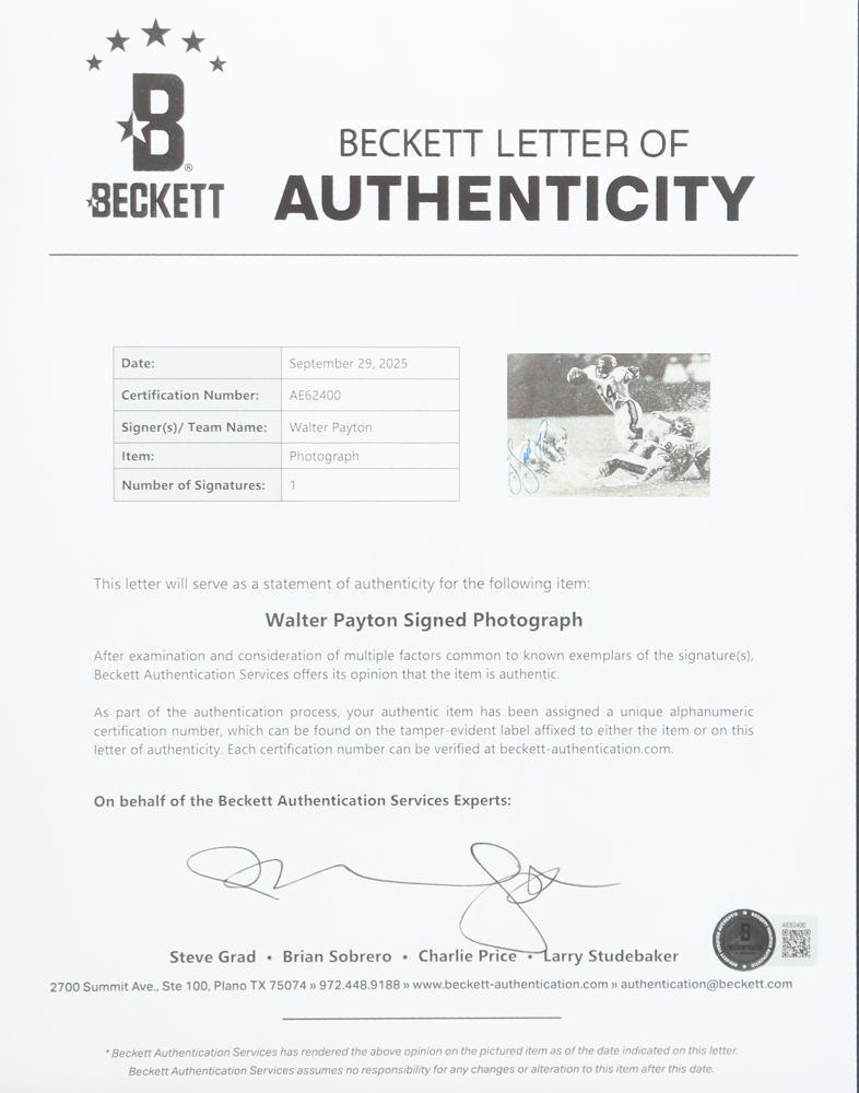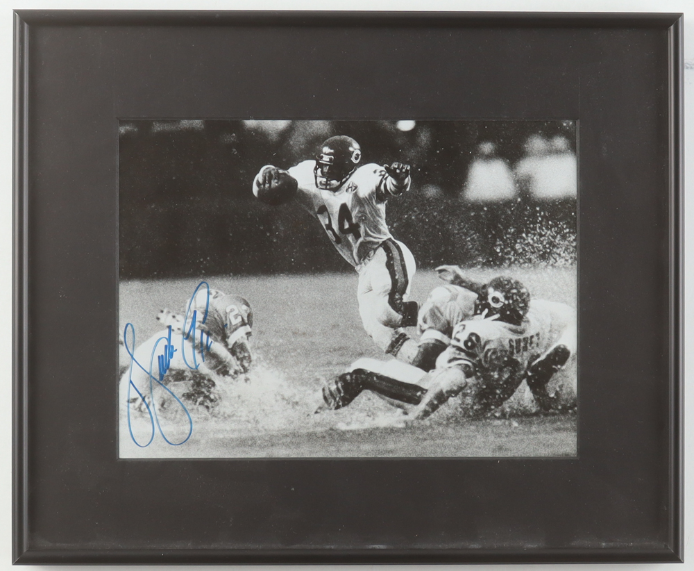 Custom frame measures 11" x 13" in size and features a photo that has been hand-signed by Walter Payton (D.1999, Chicago Bears, HOF). Please see photos for more details.