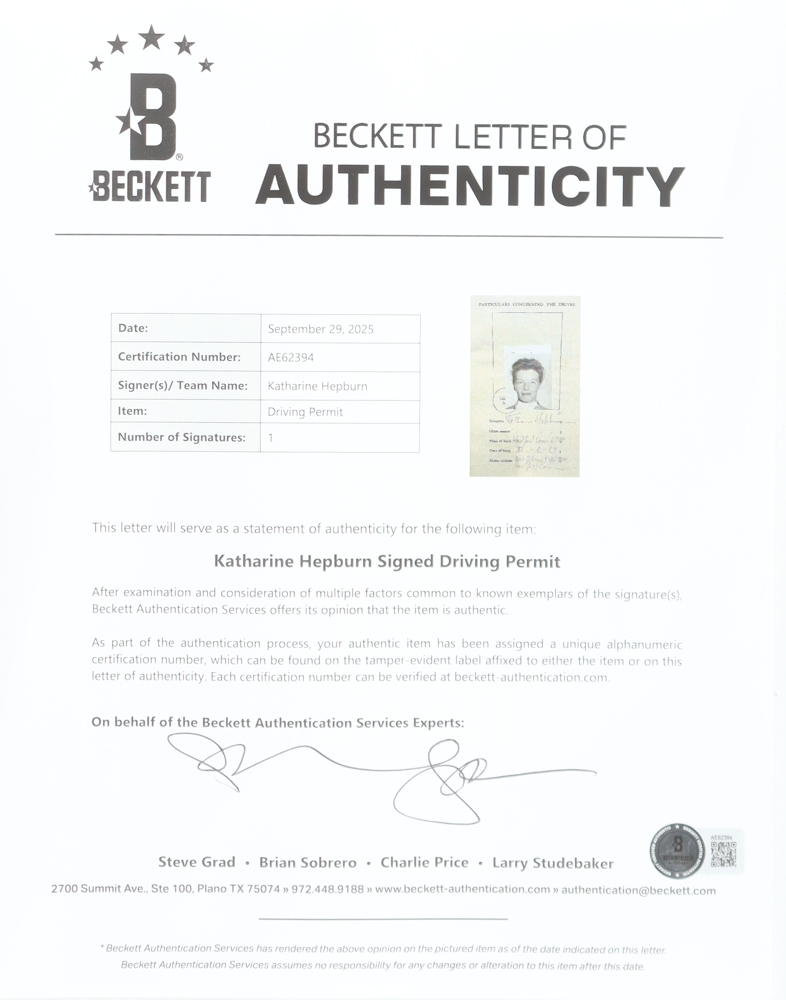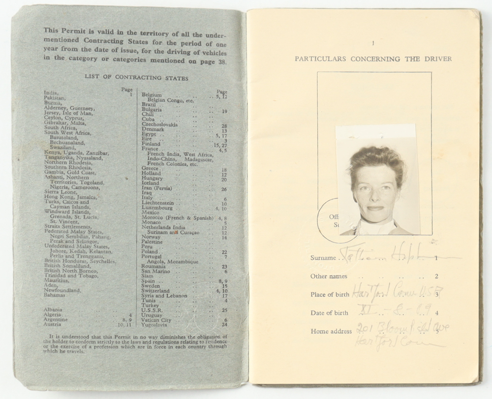Katharine Hepburn Signed International Driving Permit (ACOA)