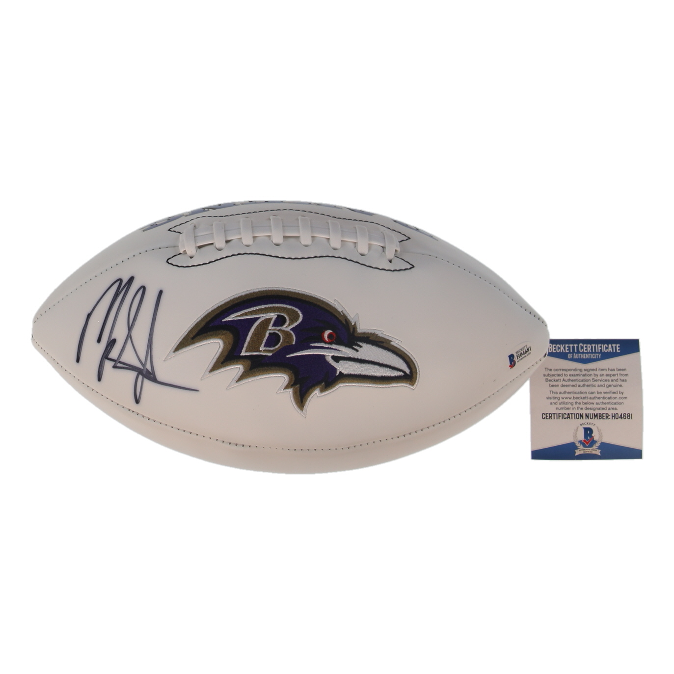 Baltimore Ravens logo white panel football. Hand-signed by Mark Ingram. Please note, the signature has begun to fade.