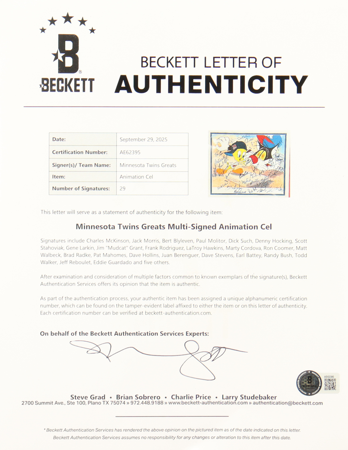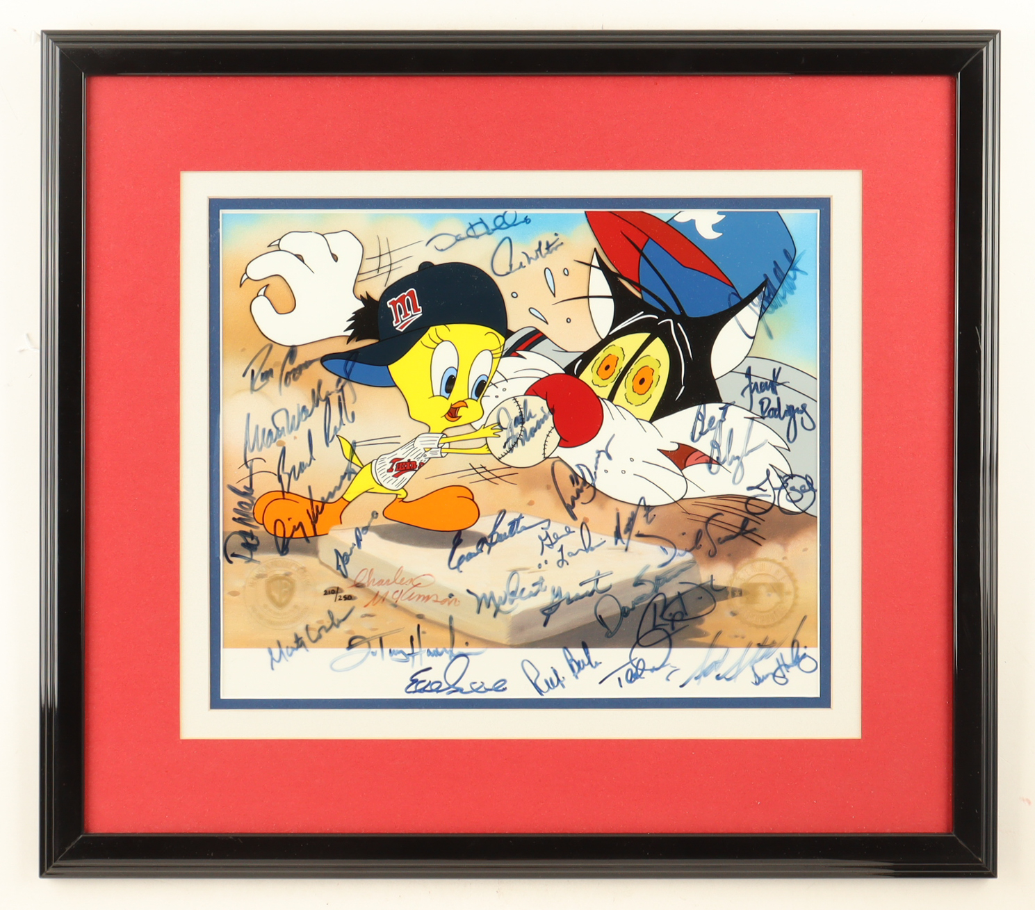 Custom frame measures 18” x 20” in size and features an animation two piece cel "I Tawt I Tagged A Puddy Tat - Tweety & Sylvester" from 1992 that has been hand-signed by Charles McKinson, Jack Morris, Bert Blyleven, Paul Molitor, Dick Such, Denny Hocking, Scott Stahoviak, Gene Larkin, Jim "Mudcat" Grant, Frank Rodriguez, LaTroy Hawkins, Marty Cordova, Ron Coomer, Matt Walbeck, Brad Radke, Pat Mahomes, Dave Hollins, Juan Berenguer, Dave Stevens, Earl Battey, Randy Bush, Todd Walker, Jeff Reboulet, Eddie Guardado and five others.
