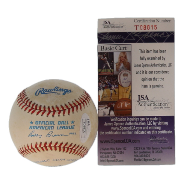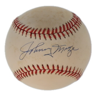 Rawlings Official American League Baseball. Hand-signed by Johnny Mize (D. 1993, St. Louis Cardinals, HOF). Please note, there are minor stains throughout the baseball and it is naturally toned.
