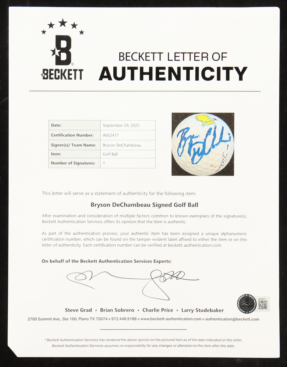 Bryson DeChambeau Signed Masters Logo Golf Ball (Beckett)