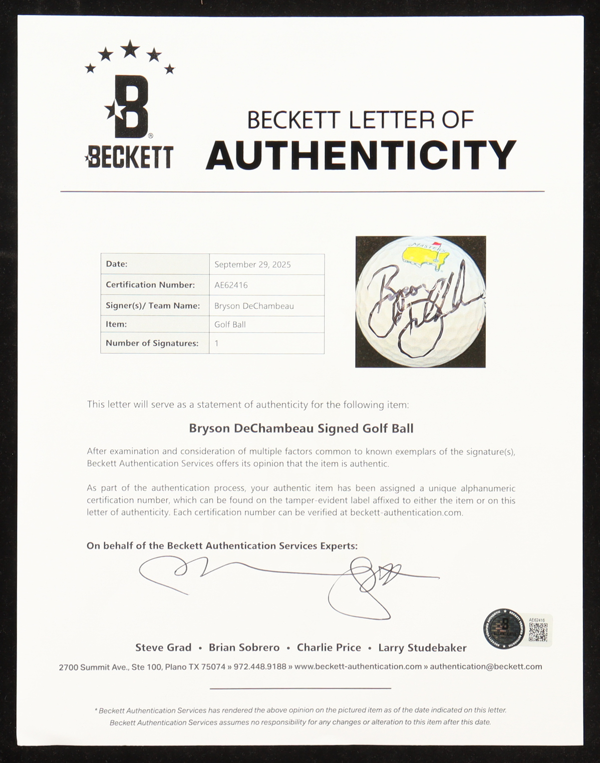 Bryson DeChambeau Signed Masters Logo Golf Ball (Beckett)