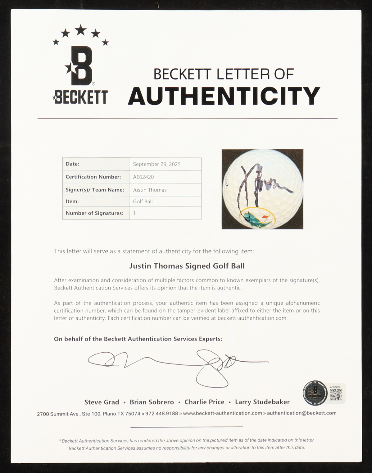The autograph includes an official Beckett Authentication Services hologram and matching LOA for authenticity purposes.