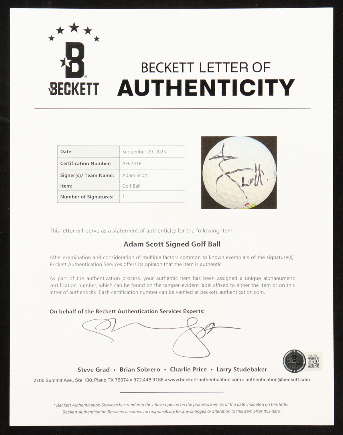 Adam Scott Signed Masters Tournament Logo Golf Ball (Beckett)