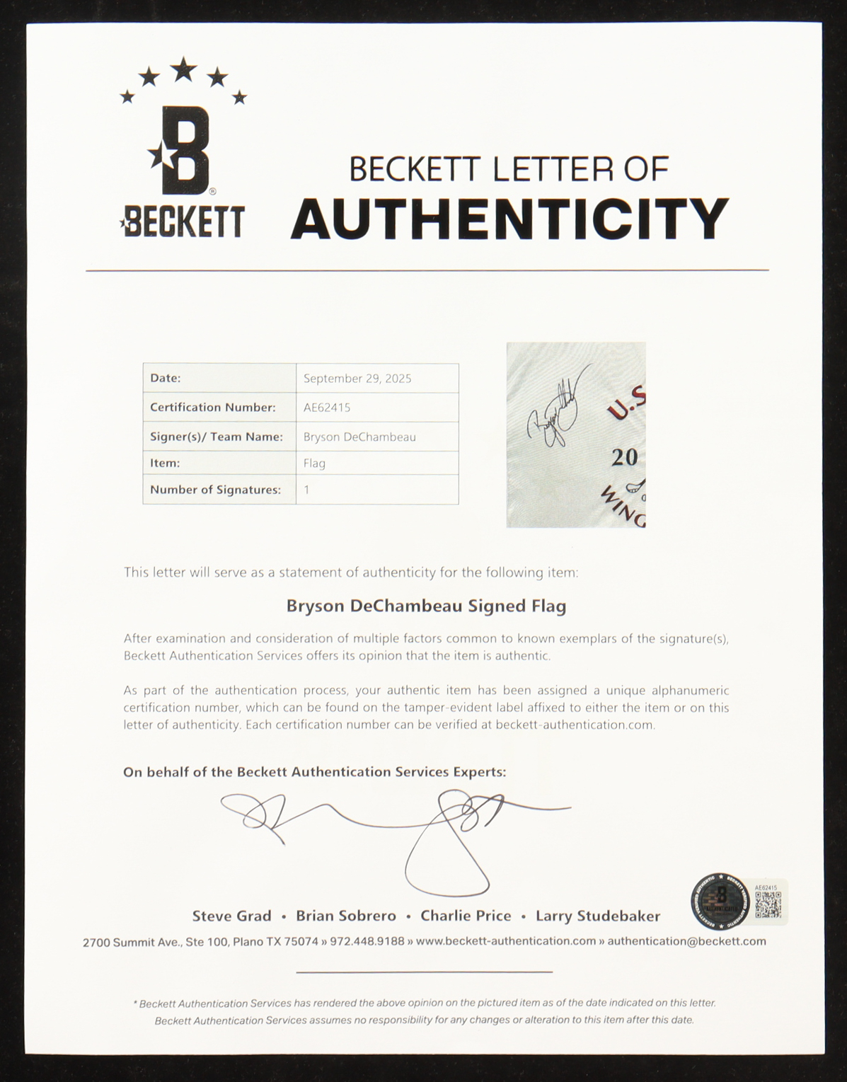 Golf Pin Flag measures approximately 14" x 20" in size and has been hand-signed by Bryson DeChambeau.