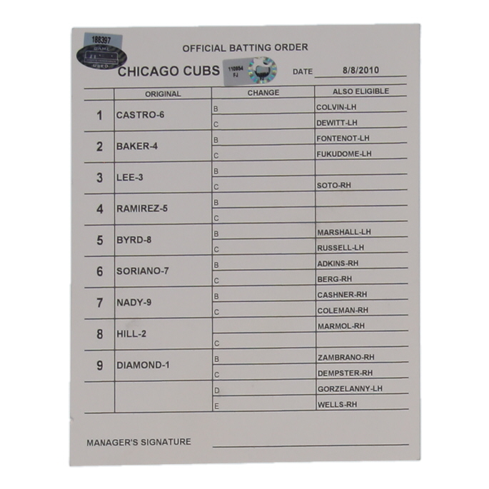 Chicago Cubs game-used batting order lineup card dated August 8, 2010.