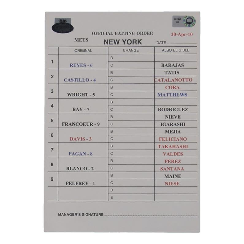 2010 Mets Official Game-Used Batting Order Lineup Card (MLB & Steiner)