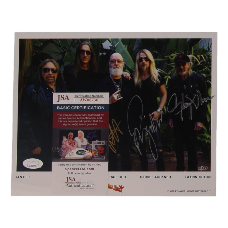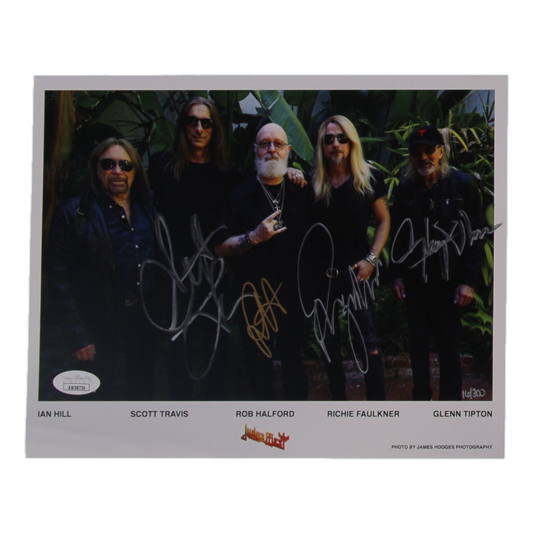 Photograph measures 8" x 10" in size. Hand-signed by Rob Halford, Scott Travis, Richie Faulkner, and Glenn Tipton.