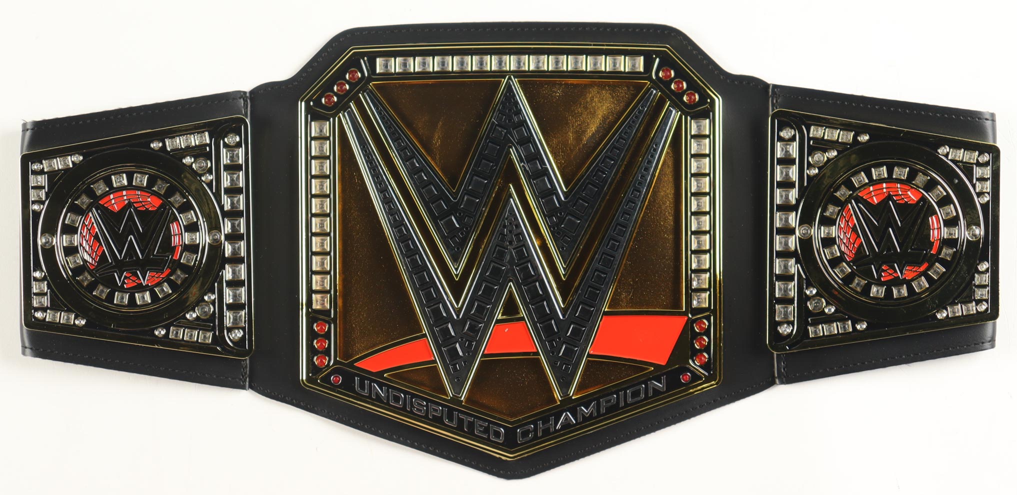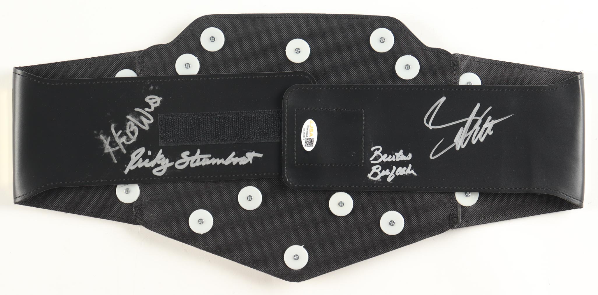 WWE plastic toy replica championship belt. Measures approximately 37" in length. Hand-signed by Ricky Steamboat (HOF), Kevin Nash, (HOF), Brutus Beefcake (HOF), and Greg Valentine (HOF). Please note, some of the signatures are smudged.