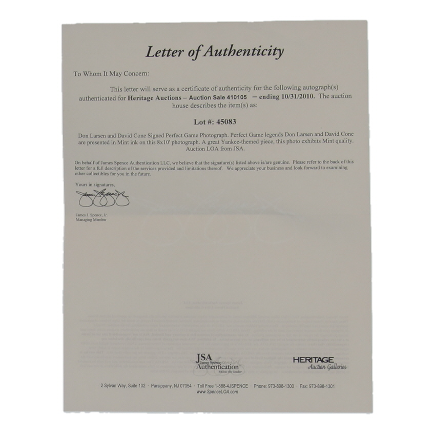 Photograph measures 8" x 10" in size and has been hand-signed and inscribed by Don Larsen (d. 2020, New York Yankees) and David Cone (New York Yankees).