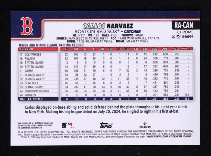 Carlos Narvaez 2025 Topps Chrome Rookie Autographs #RACAN RC