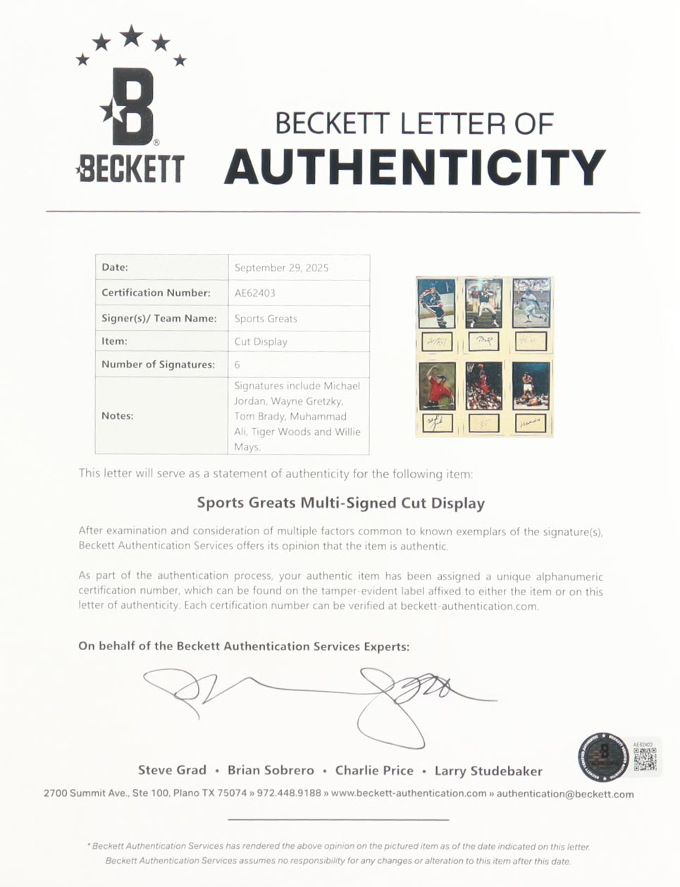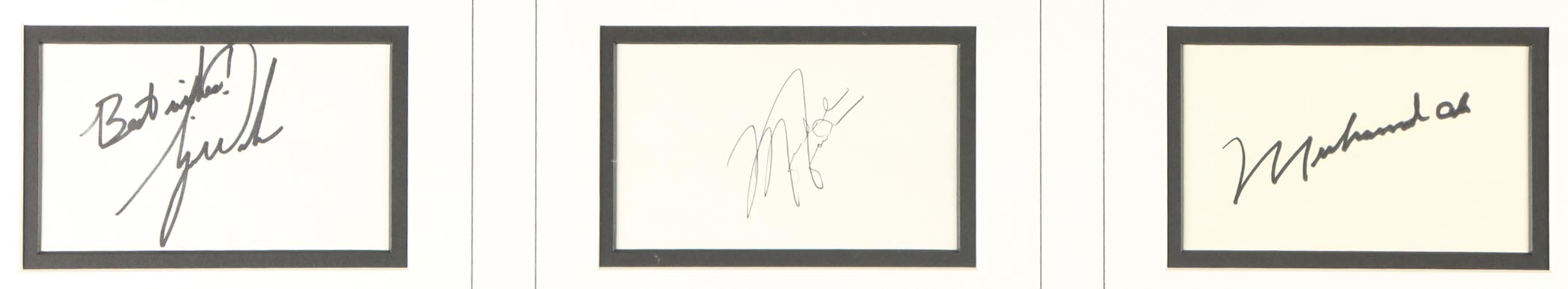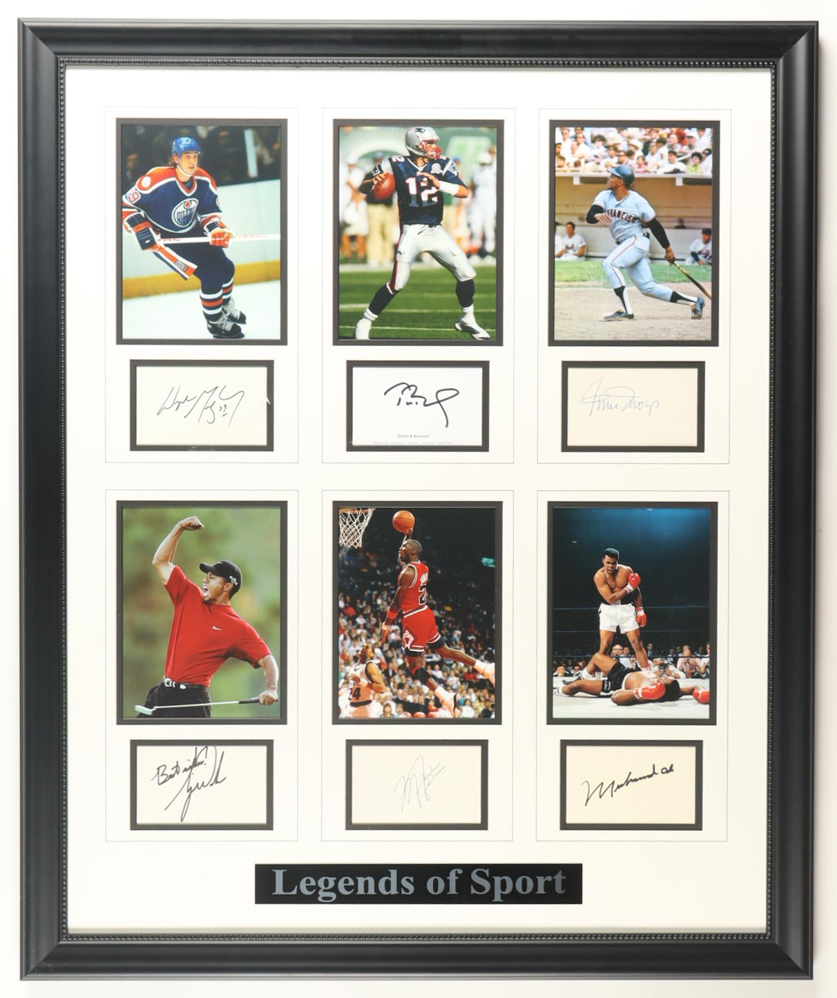 Custom frame measures 29" x 35" in size. Index cards are hand-signed by Tom Brady (New England Patriots), Michael Jordan (Chicago Bulls, HOF), Wayne Gretzky (Edmonton Oilers, HOF), Tiger Woods (HOF), Muhammad Ali, and Willie Mays (San Francisco Giants, HOF).
