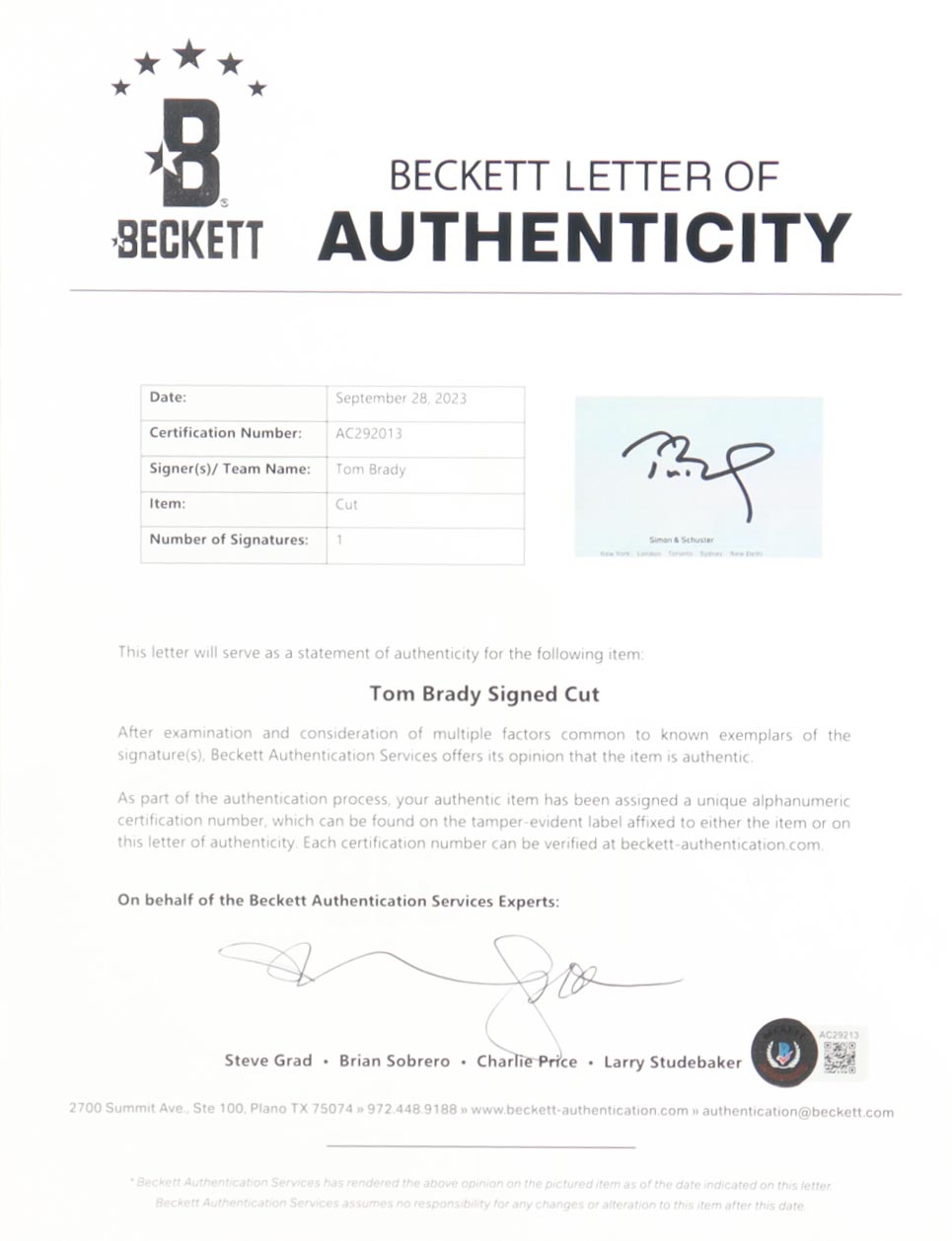 The autograph includes an official Beckett Authentication Services hologram and matching LOA for authenticity purposes.