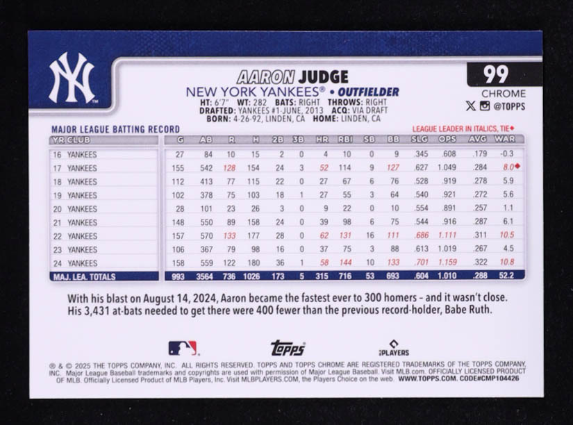 Aaron Judge 2025 Topps Chrome Green Lava Refractors #99 #27/99