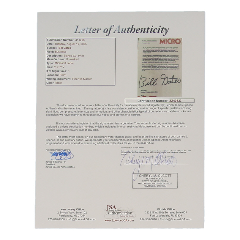 Print measuring 5" x 7" in size. Hand-signed by Bill Gates.