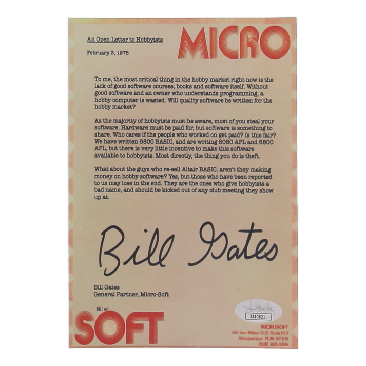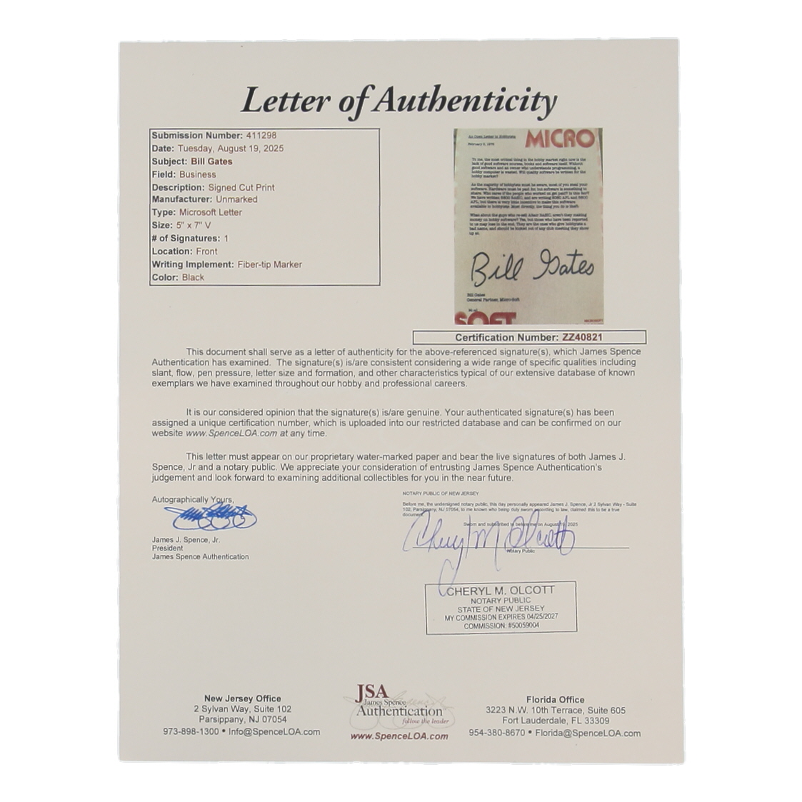 Print measuring 5" x 7" in size. Hand-signed by Bill Gates.