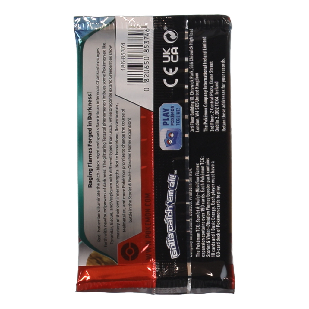 Red-hot embers illuminate the pitch-black night and sparks flare into an inferno as Charizard ex surges forth with newfound powers of darkness! The glittering Terastal phenomenon imbues some Pokémon ex like Tyranitar, Eiscue, and Vespiquen with different types than usual, while Dragonite ex and Greedent ex show mastery of their own inner strengths. Not to be outdone, Revavroom ex, Melmetal ex, and more Pokémon promise to change the course of battle in the Scarlet & Violet—Obsidian Flames expansion!