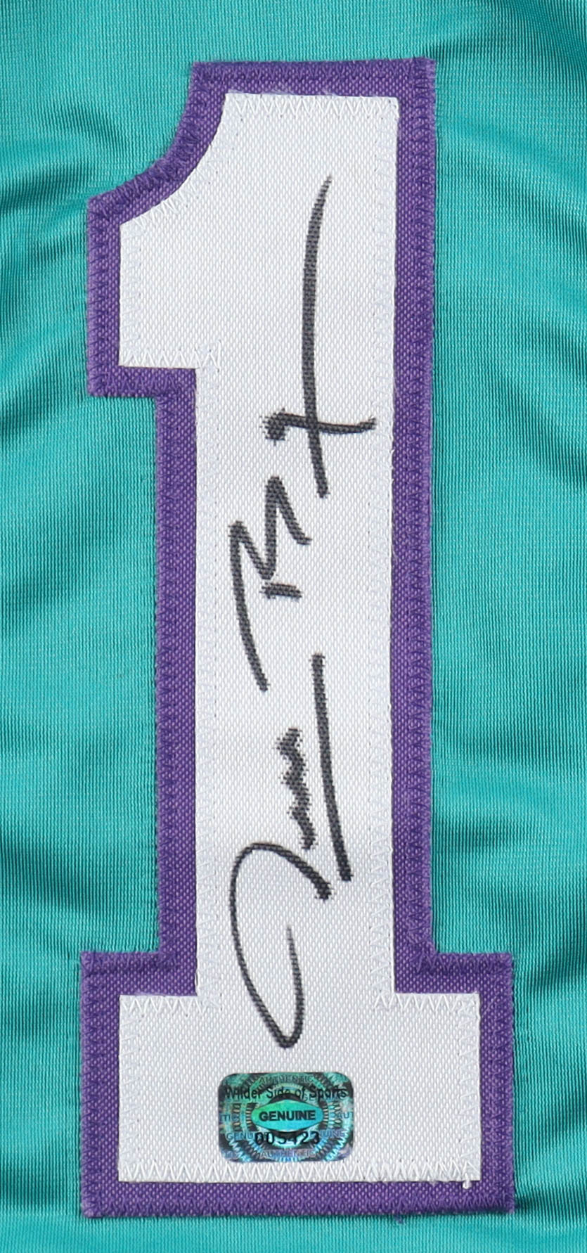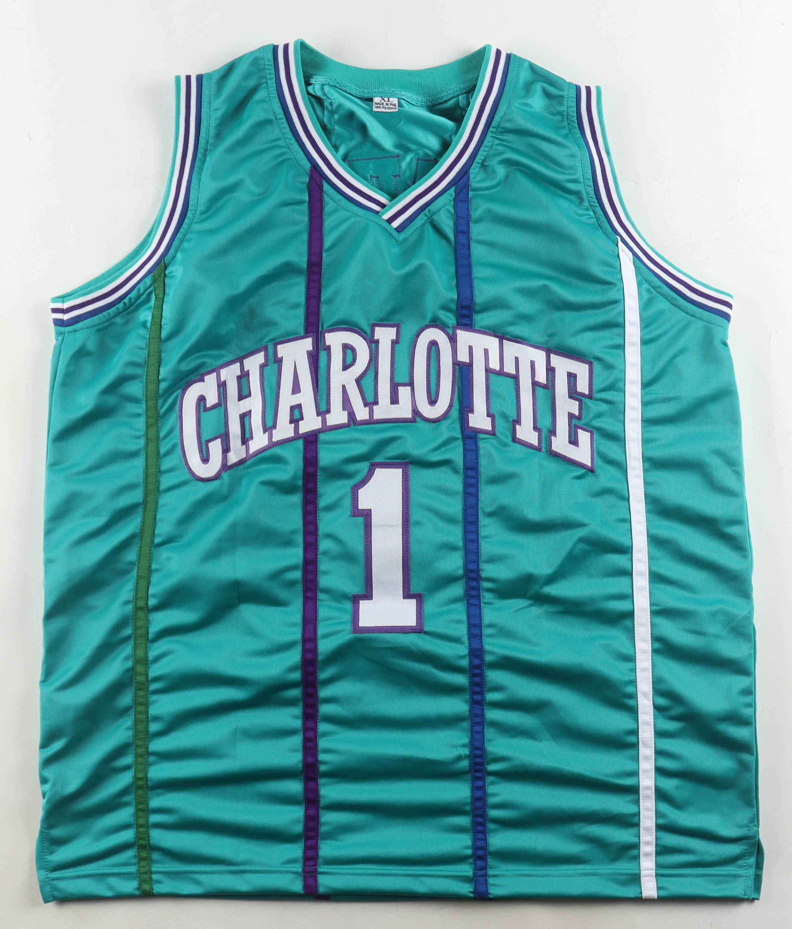 Custom jersey with everything sewn on, size XL. Hand-signed by Muggsy Bogues.