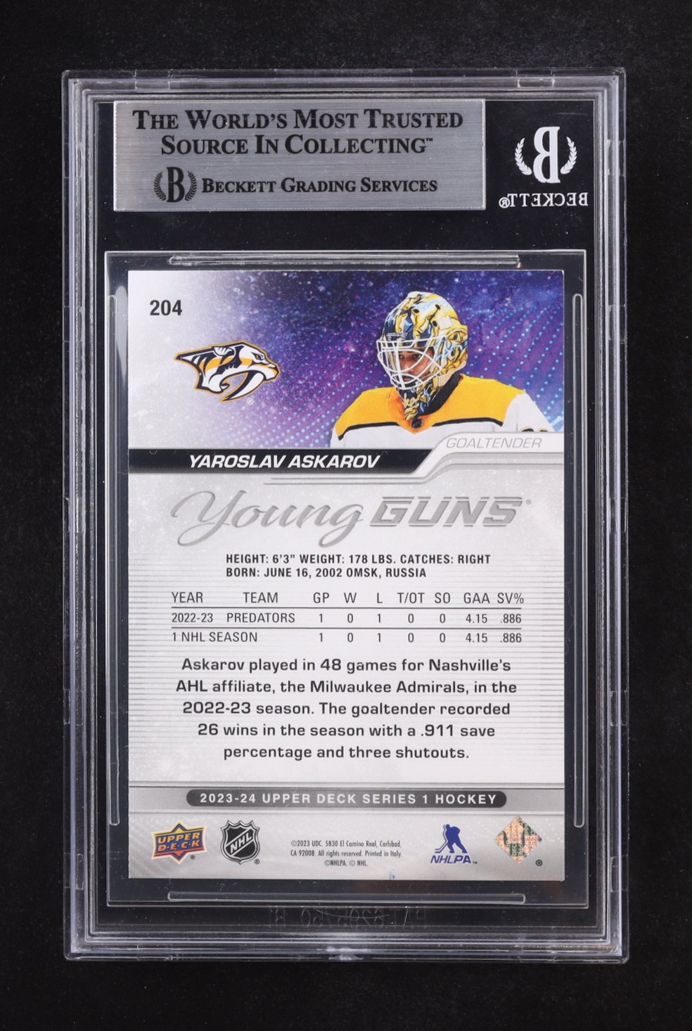 Yaroslav Askarov Signed 2023-24 Upper Deck YG #204 (BGS)