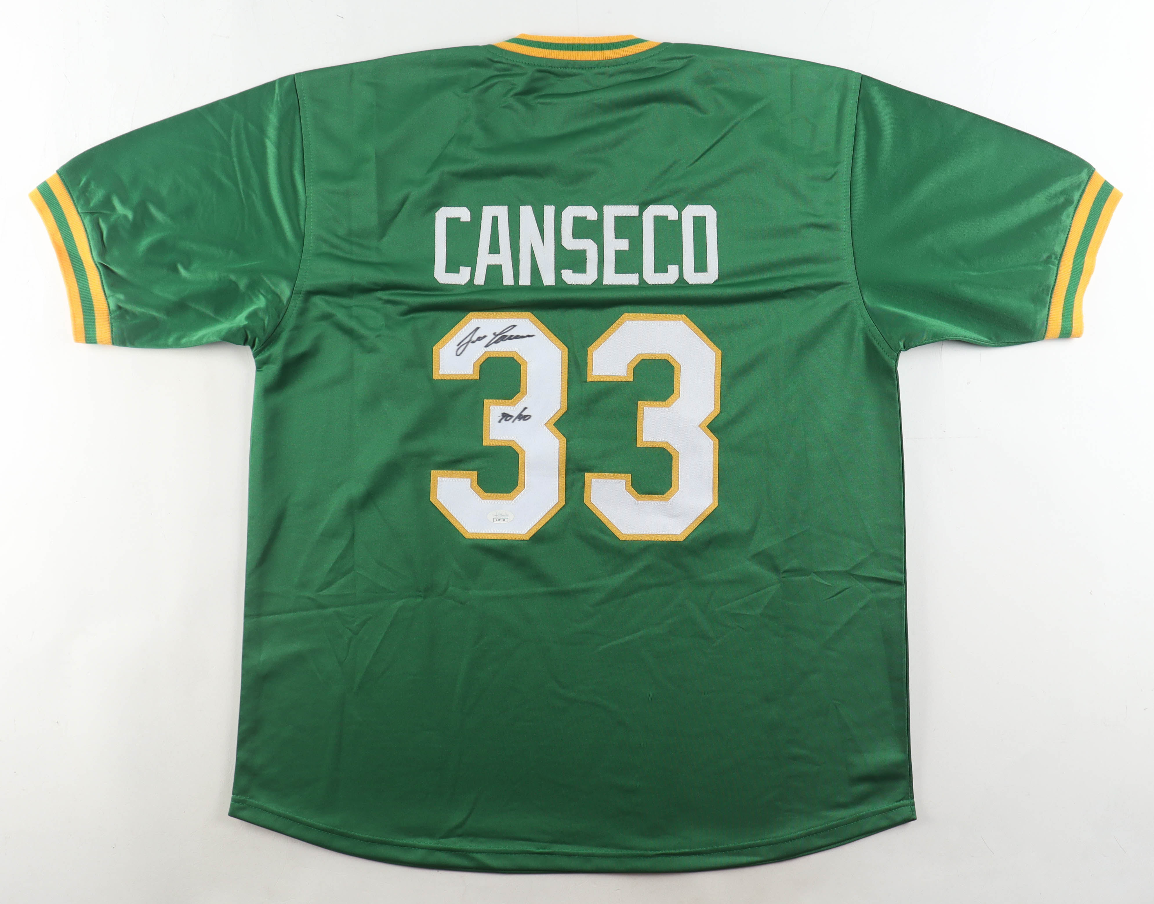 Custom jersey with everything sewn on, size XL. Hand-signed and inscribed by Jose Canseco.