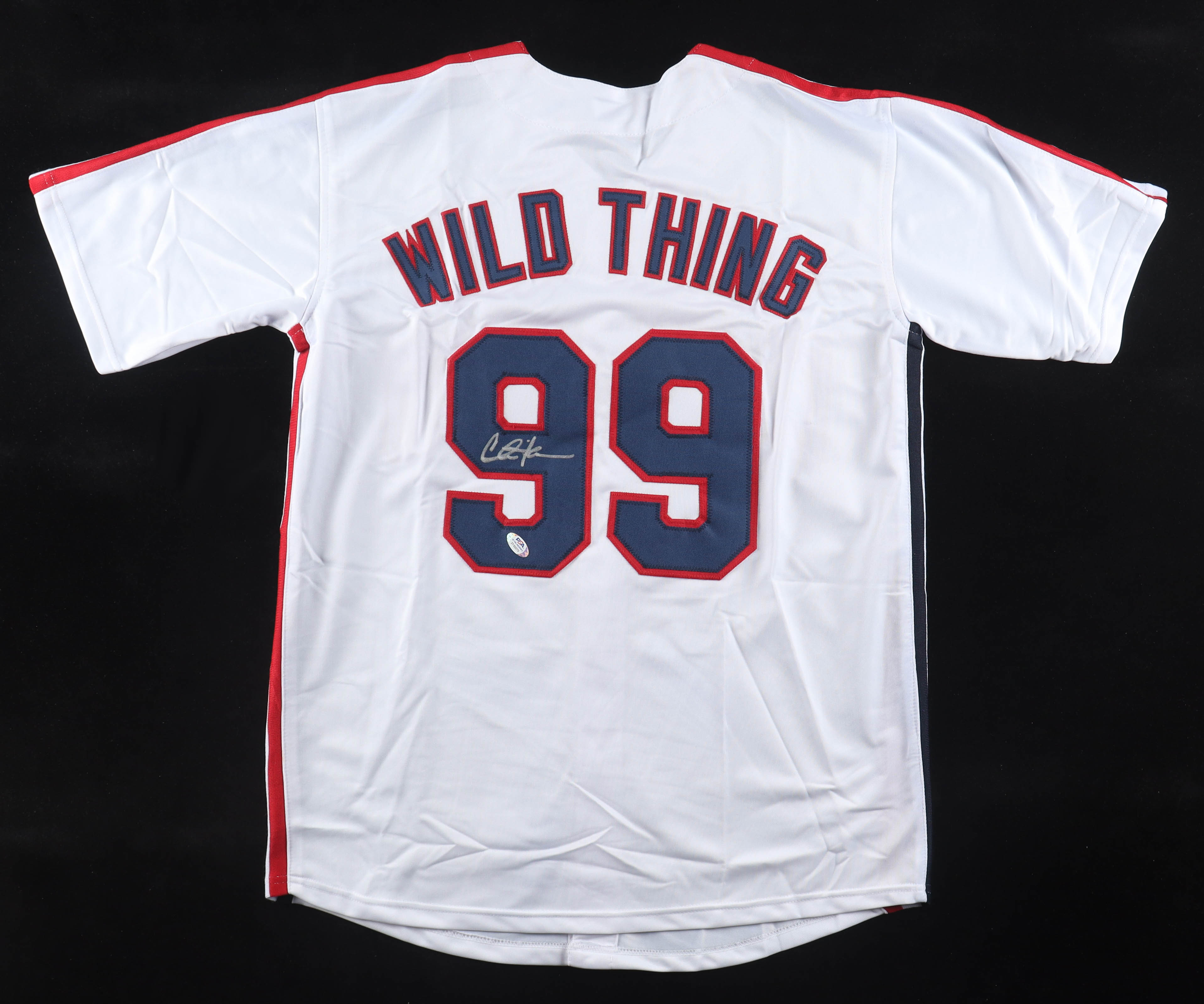 Custom jersey with everything sewn on, size XL. Hand-signed by Charlie Sheen (Ricky "Wild Thing" Vaughn).