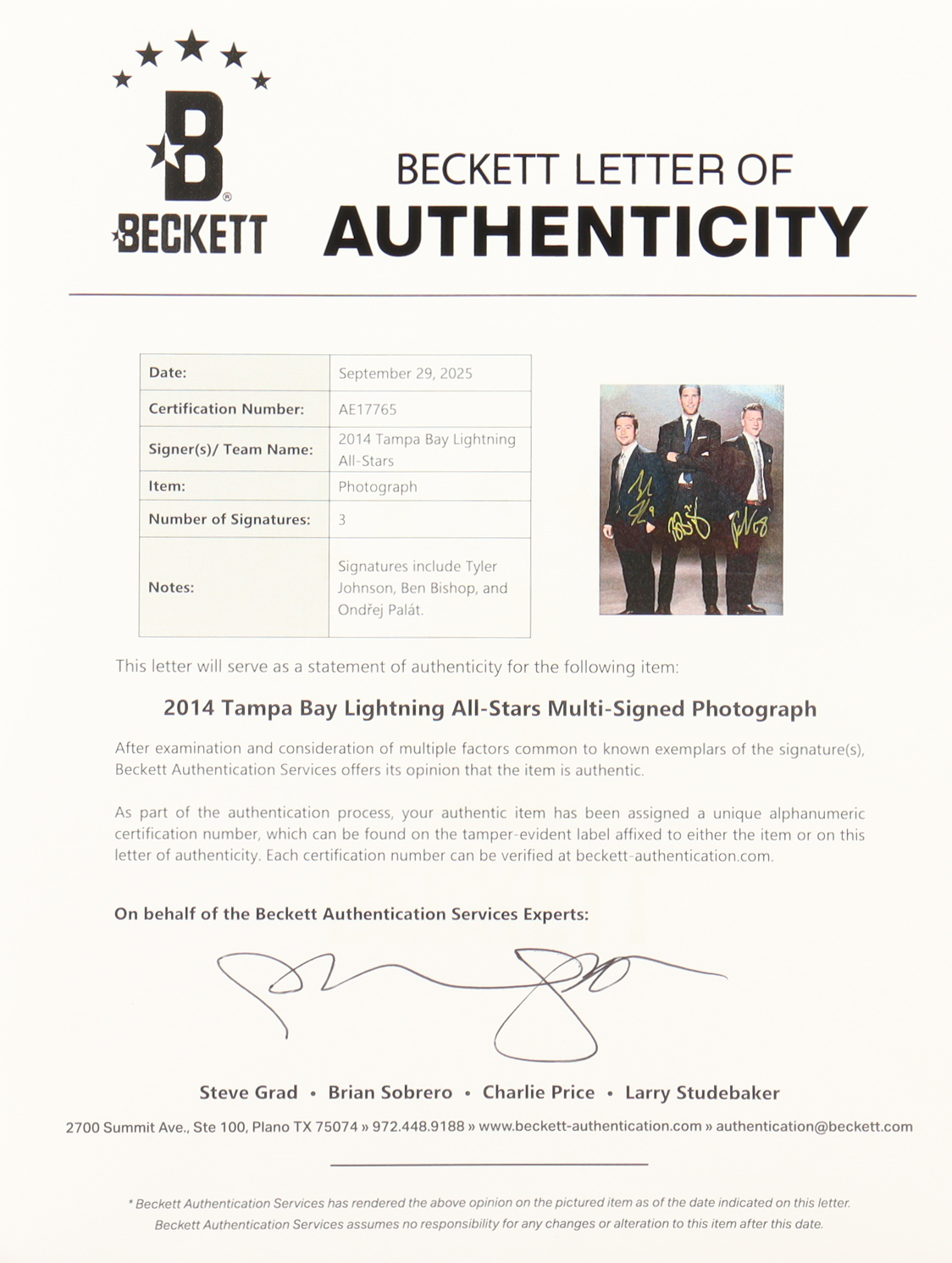 Photo measures 8" x 10" in size and has been hand-signed by Ondrej Palat (Tampa Bay Lightning), Ben Bishop and Tyler Johnson.