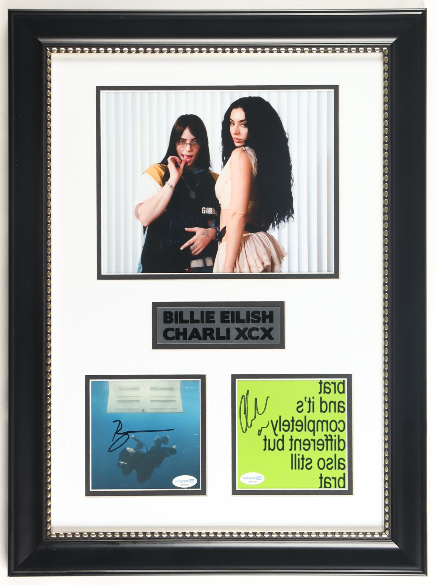 Custom frame measures approximately 17" x 23" in size and features (2) individual CD inserts hand-signed by pop sensations, Billie Eilish and Charli XCX! Billie Eilish signed a "Hit Me Hard and Soft" CD insert and Charli XCX signed a "Brat and It's Completely Different but Also Still Brat" CD insert!