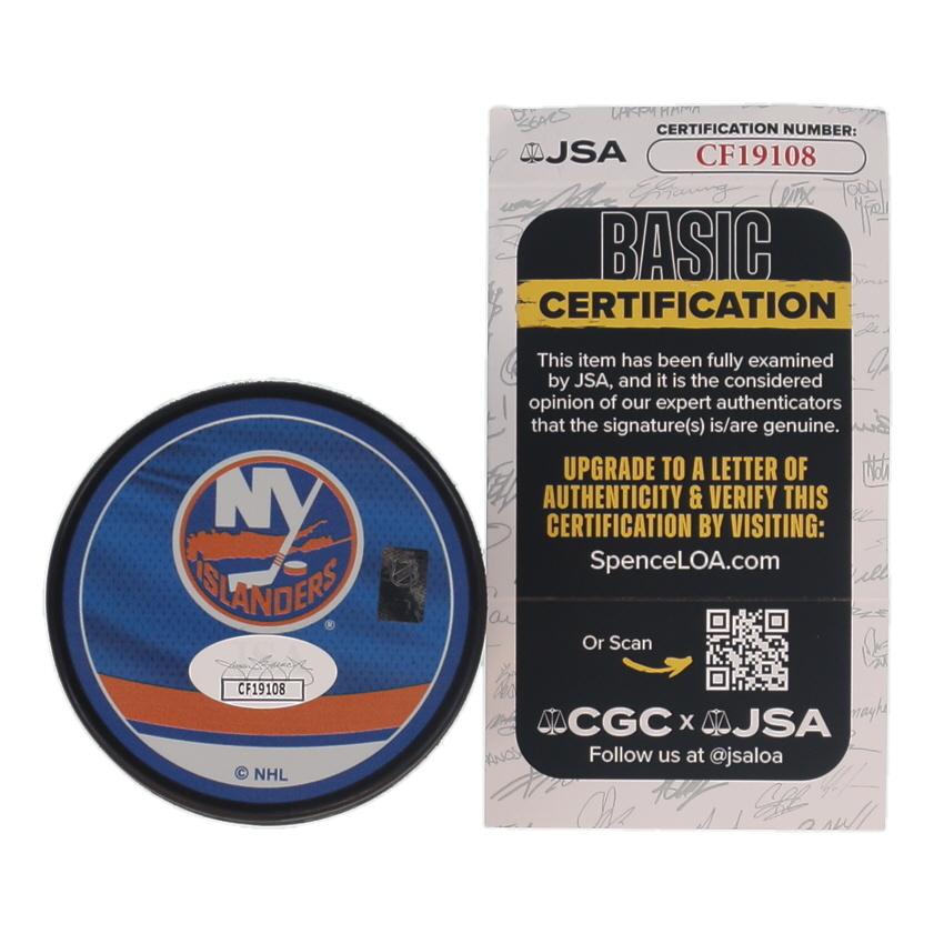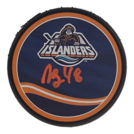 New York Islanders logo hockey puck has been hand-signed by Matthew Schaefer.