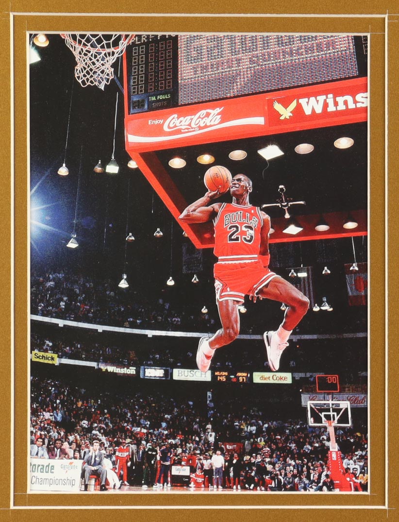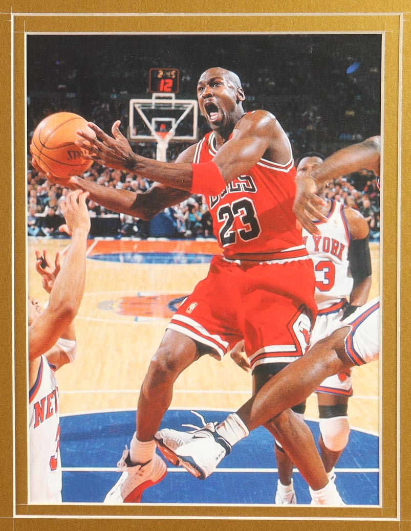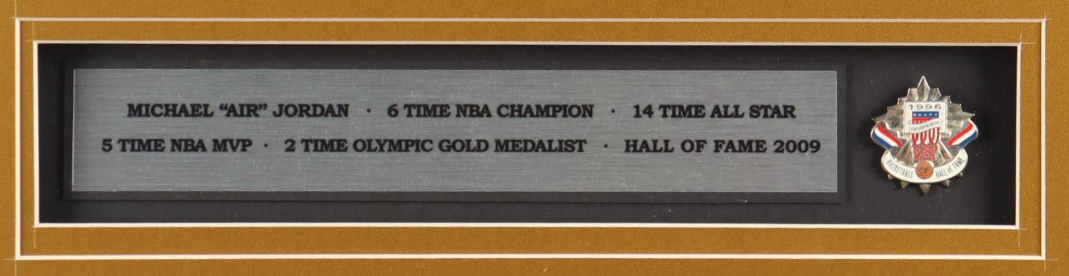 Custom frame measures approximately 32.5" x 36.5" in size and features an unsigned Michael Jordan (HOF) jersey. The display also includes a Hall of Fame induction pin, (2) 8" x 10" photos, and a full Jordan career statistics plaque. Please note, the display is unsigned.