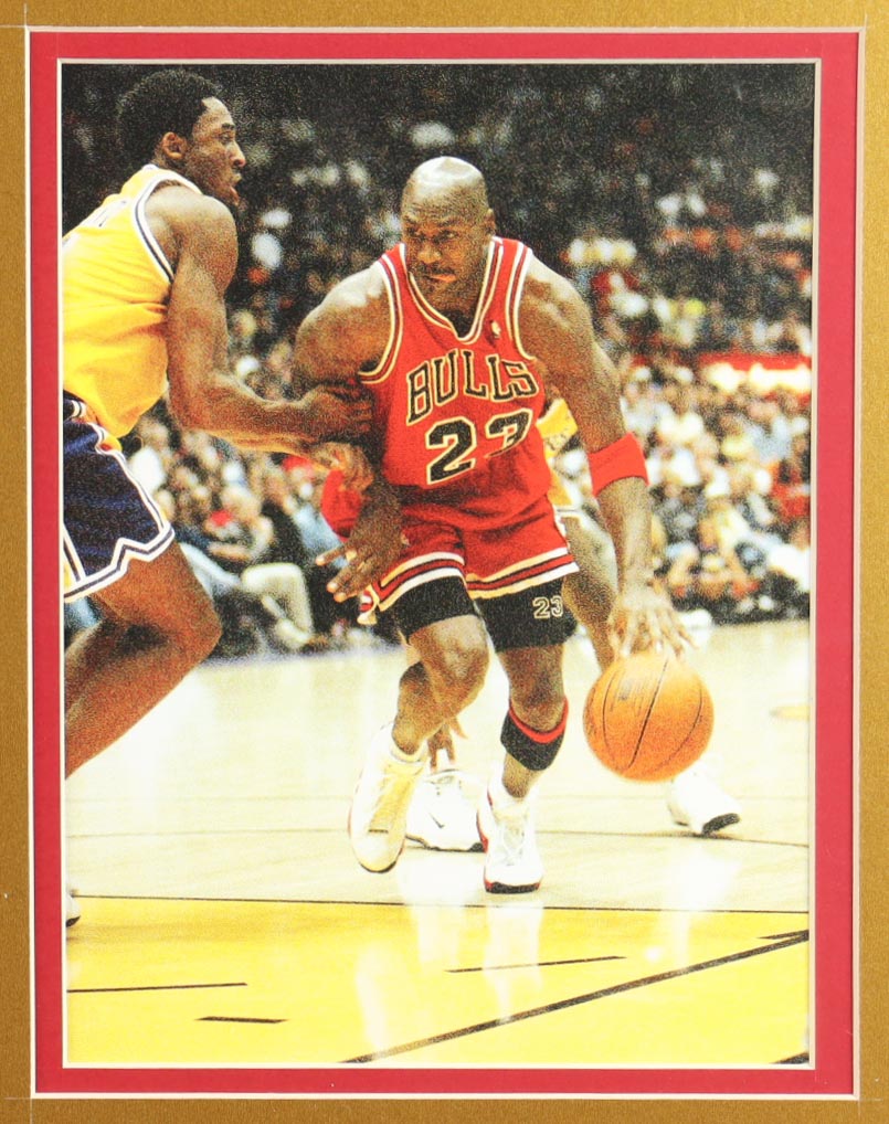 Custom frame measures approximately 32.5" x 36.5" in size and features an unsigned Michael Jordan (HOF) jersey. The display also includes (4) Chicago Bulls Championship Pins and (2) Photos. Please note, the display is unsigned.