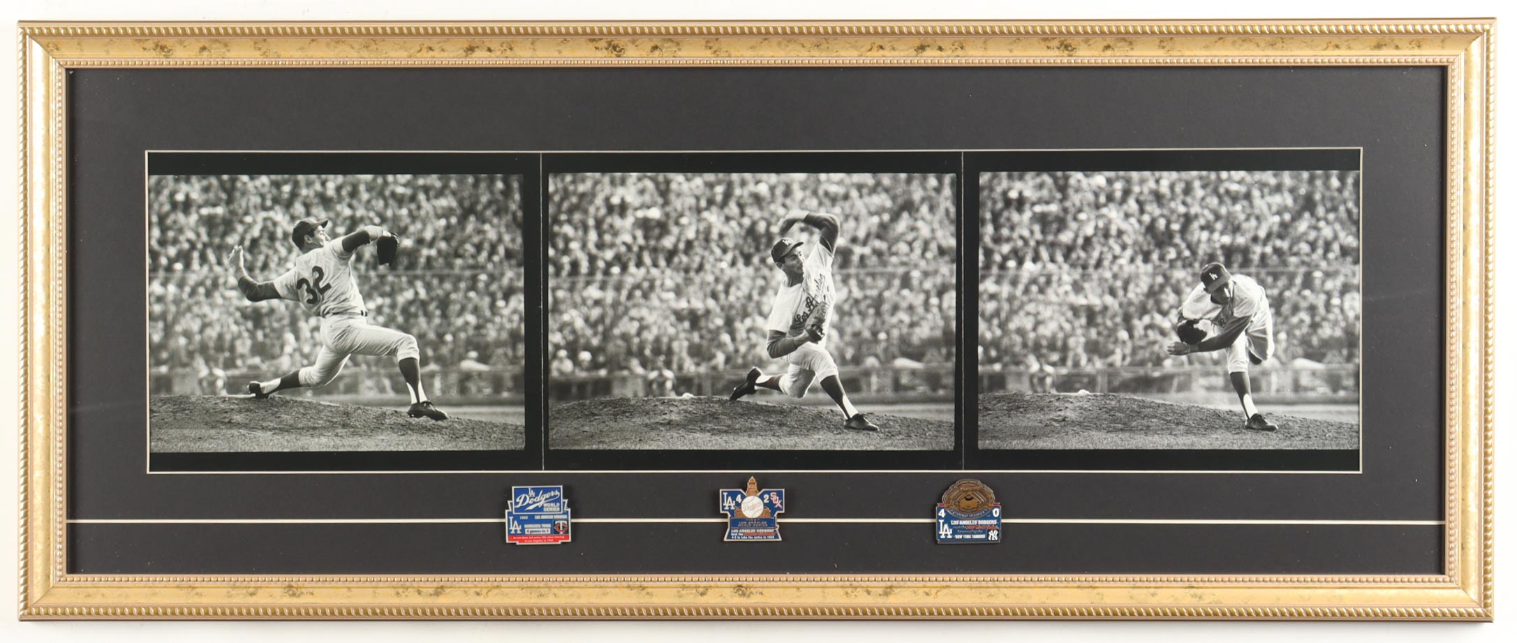 Custom frame measures 13.5" x 33.5" in size and features a panorama photo of Sandy Koufax (Los Angeles Dodgers, HOF) as well as a (3) Los Angeles Dodgers World Series Pins.. Please note display is unsigned.