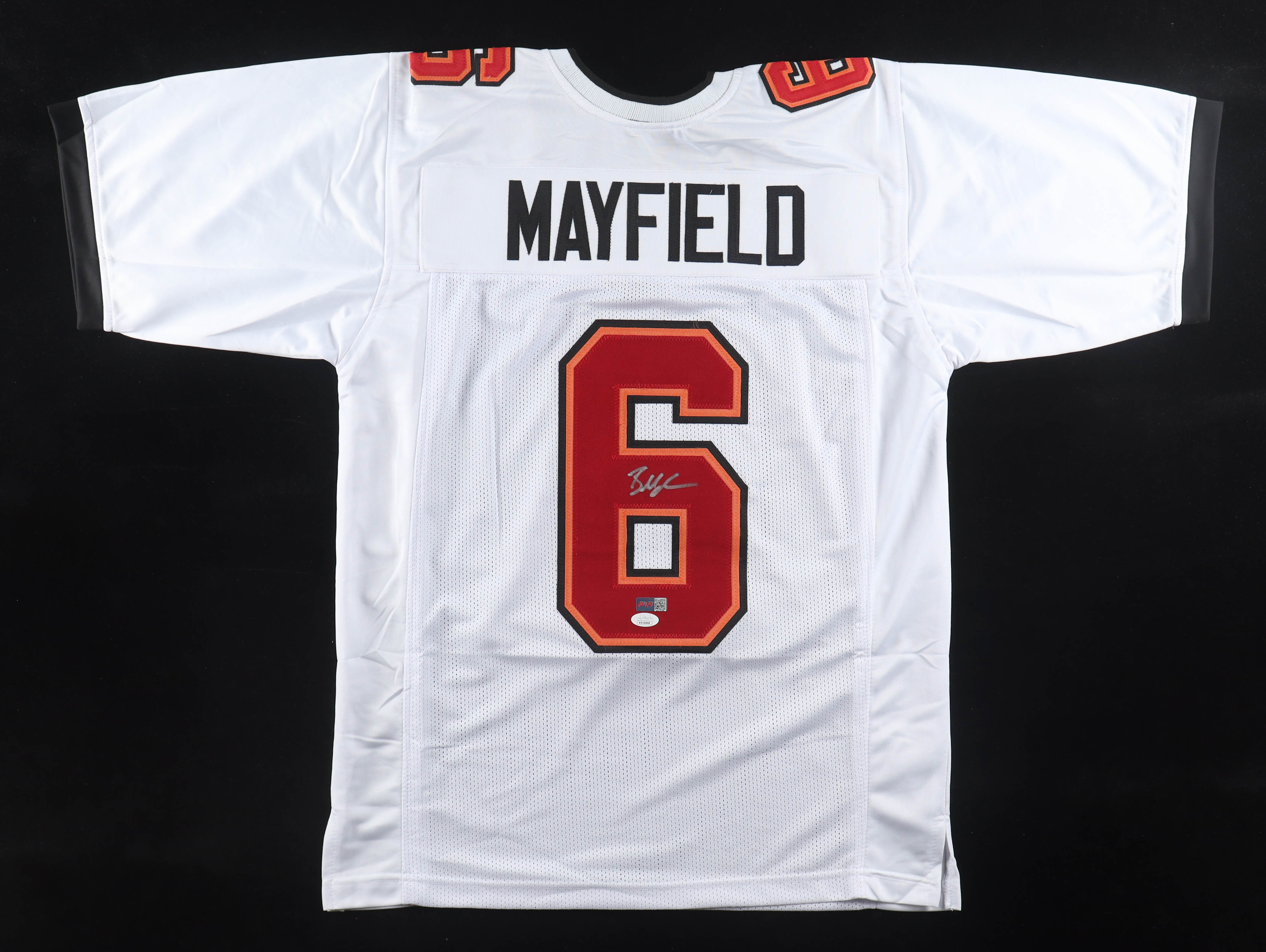 Custom jersey with everything sewn on, size XL. Hand-signed by Baker Mayfield.