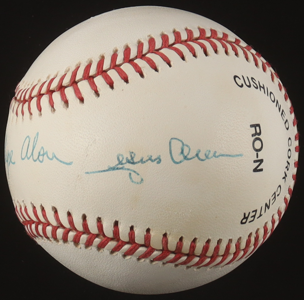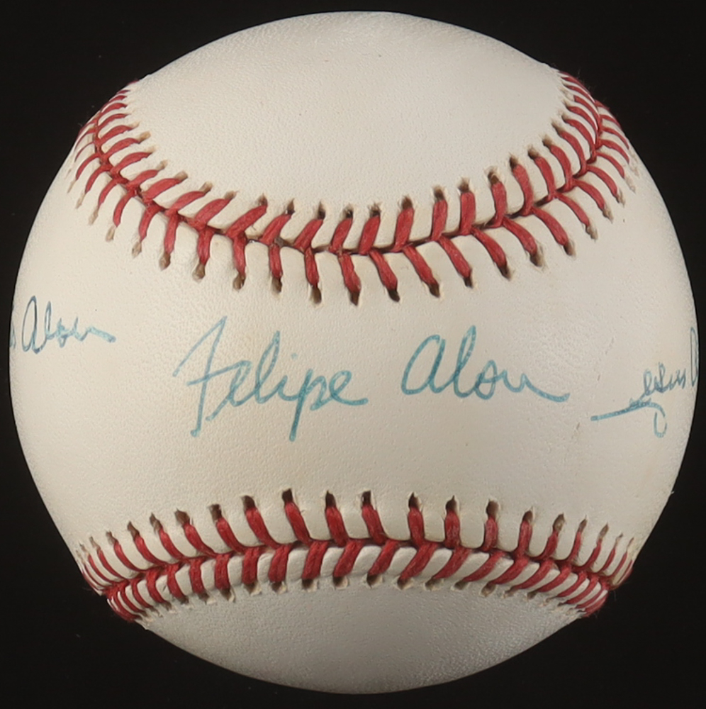 Rawlings Official National League Baseball. Hand-signed by Felipe Alou (San Francisco Giants), Matty Alou (D. 2011, San Francisco Giants), and Jesus Alou (D. 2023, San Francisco Giants). Please note, the baseball is naturally toning and stained.