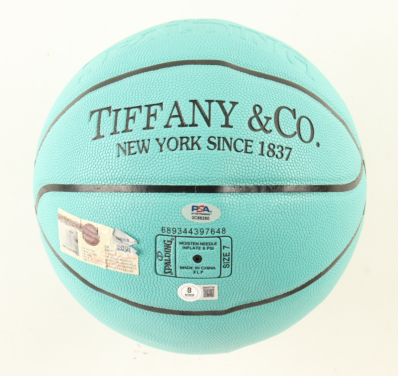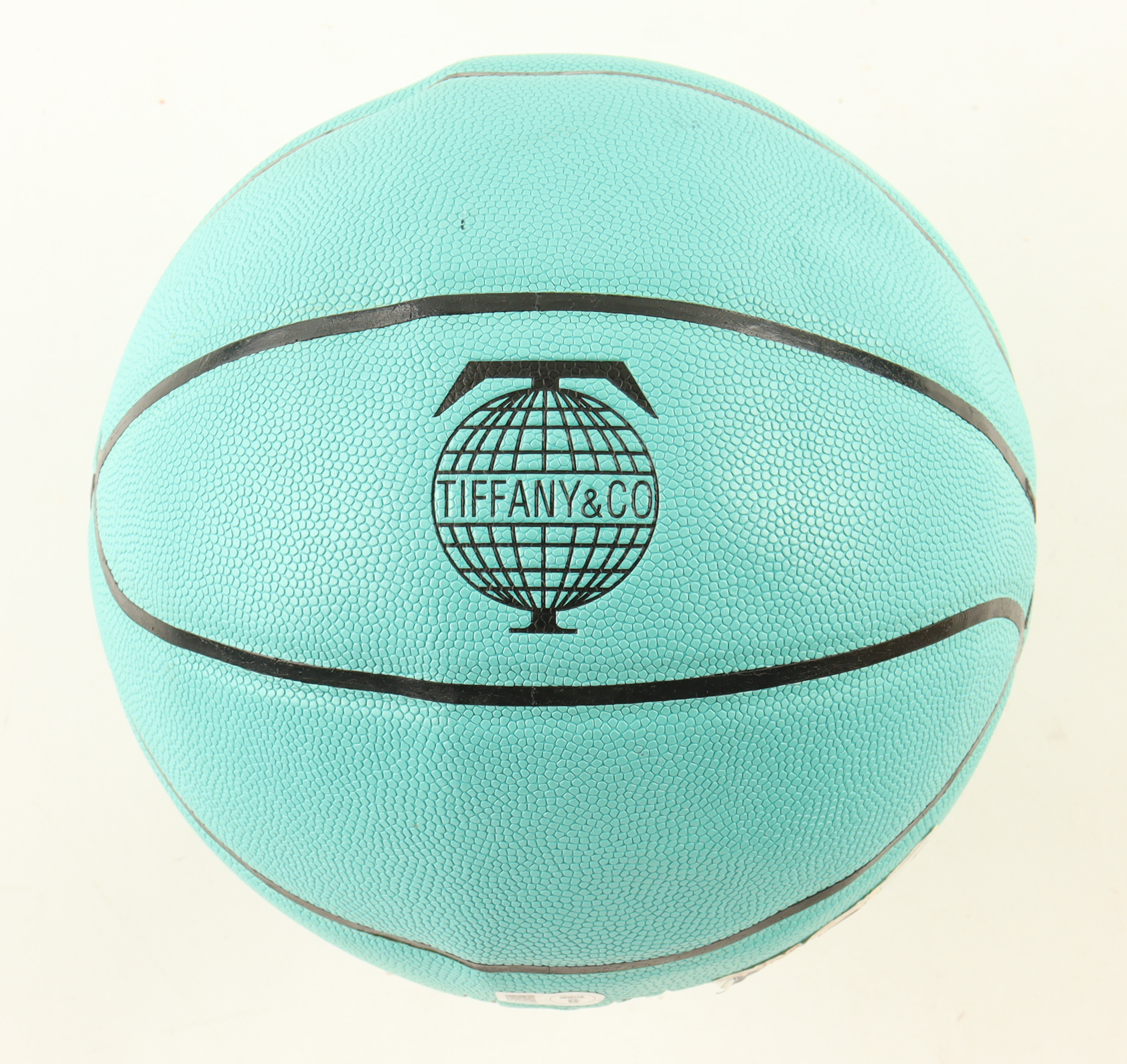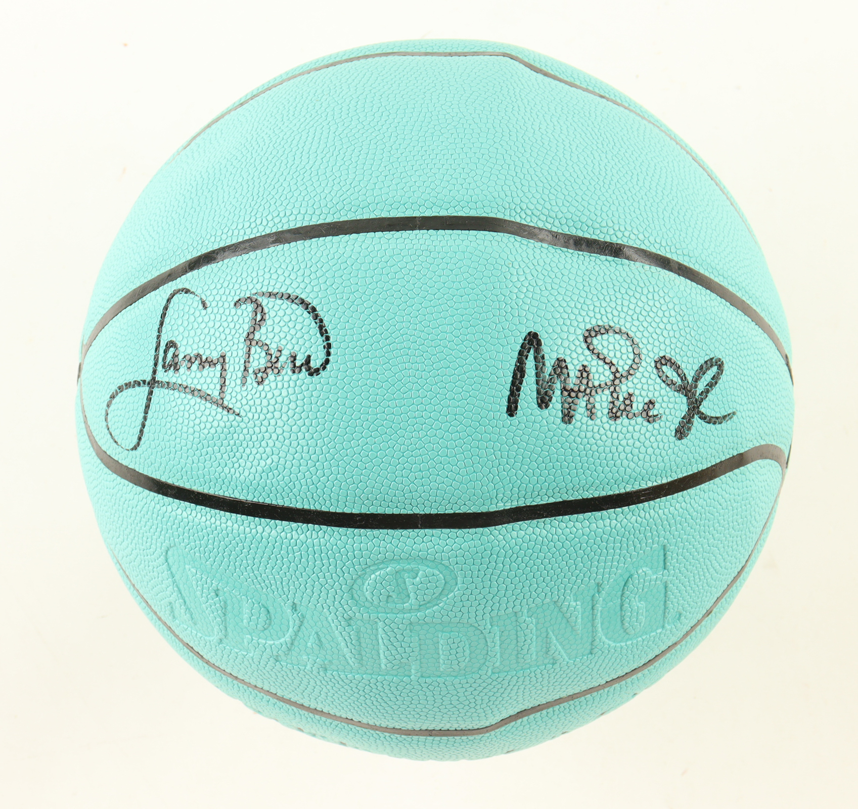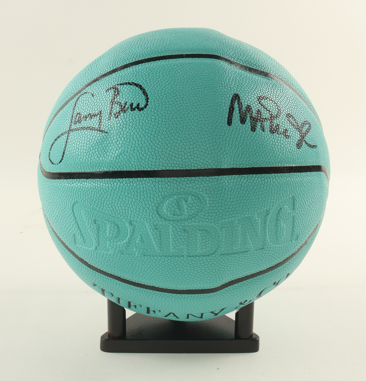 Spalding Tiffany & Co Edition basketball With Display Stand has been hand-signed by Larry Bird (Boston Celtics, HOF) & Magic Johnson (Los Angeles Lakers, HOF).