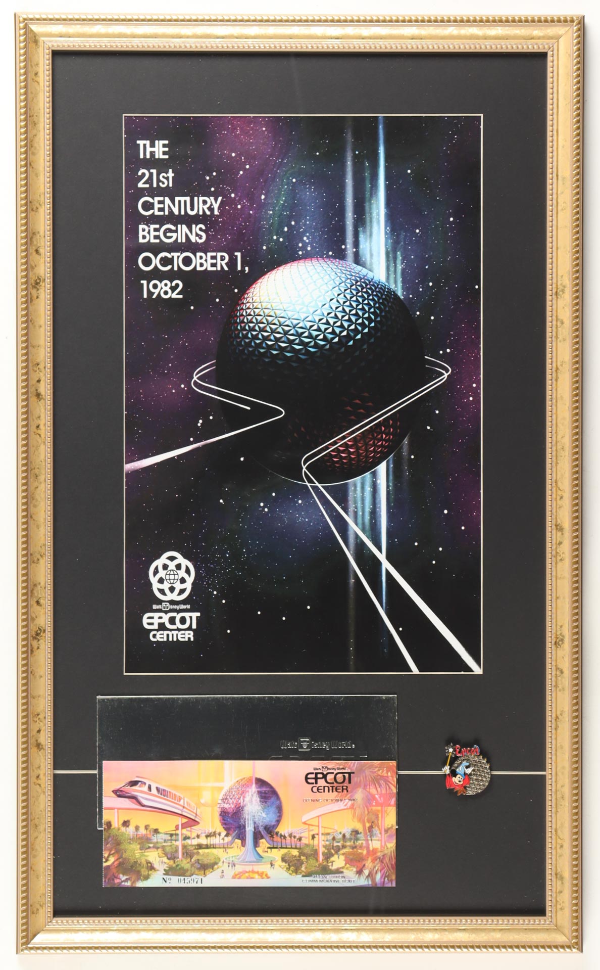 Disney World "Epcot Center" Grand Opening Custom Framed Poster with Opening Day Ticket, Silver Envelope & Vintage Epcot Mickey Mouse Pin