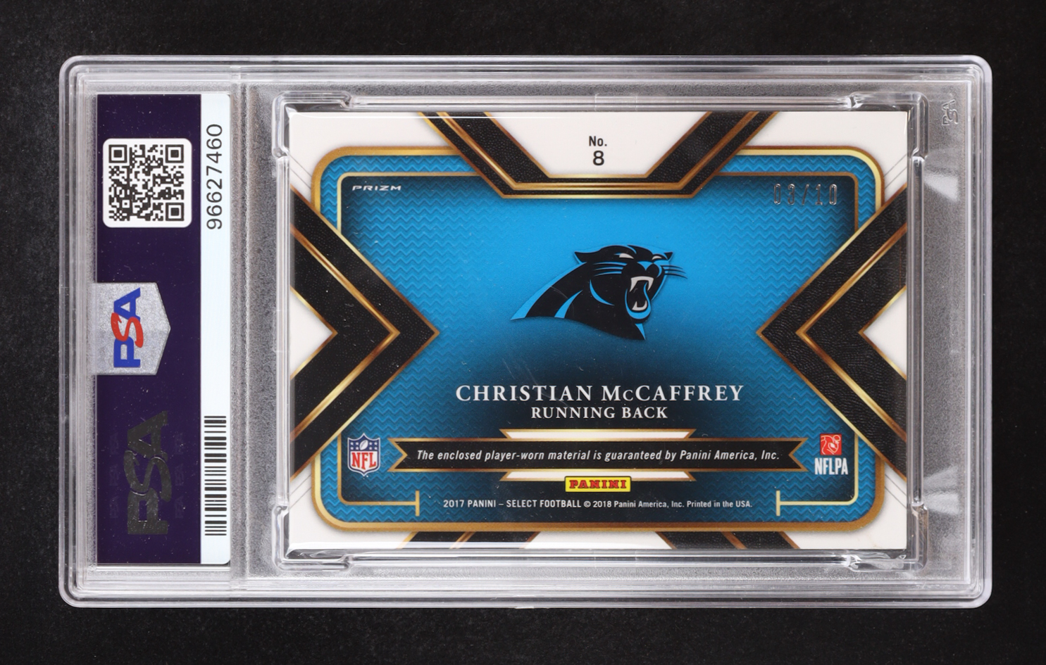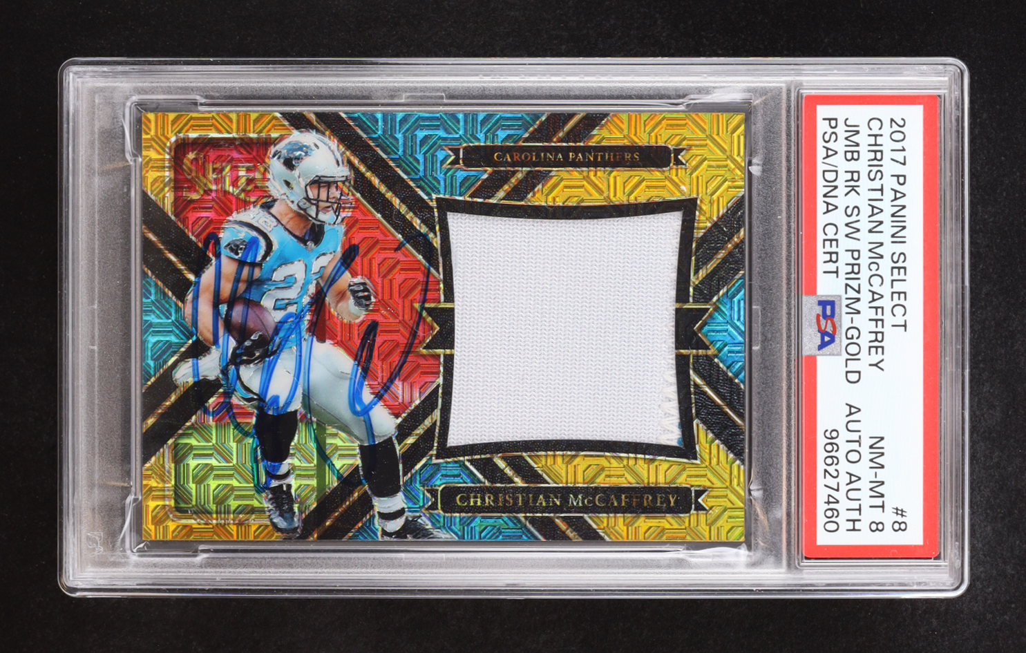 Christian McCaffrey Signed 2017 Select Jumbo Rookie Swatches Prizm Gold #8 RC #3/10 (PSA 8)
