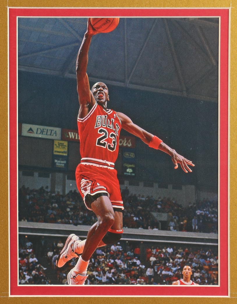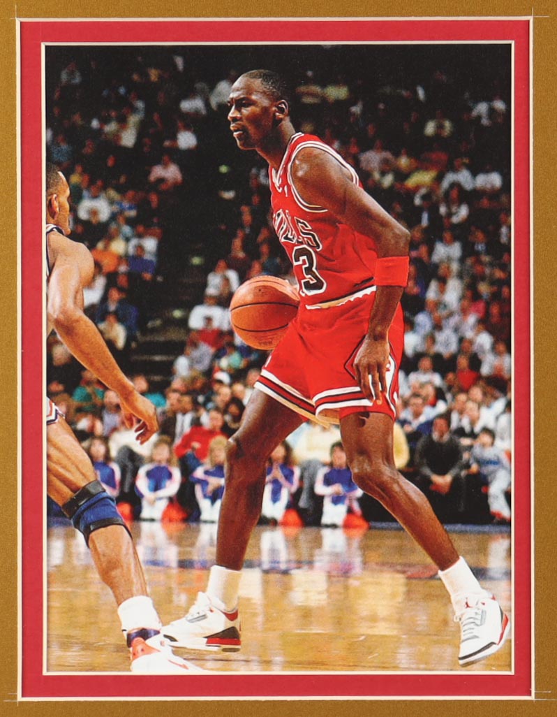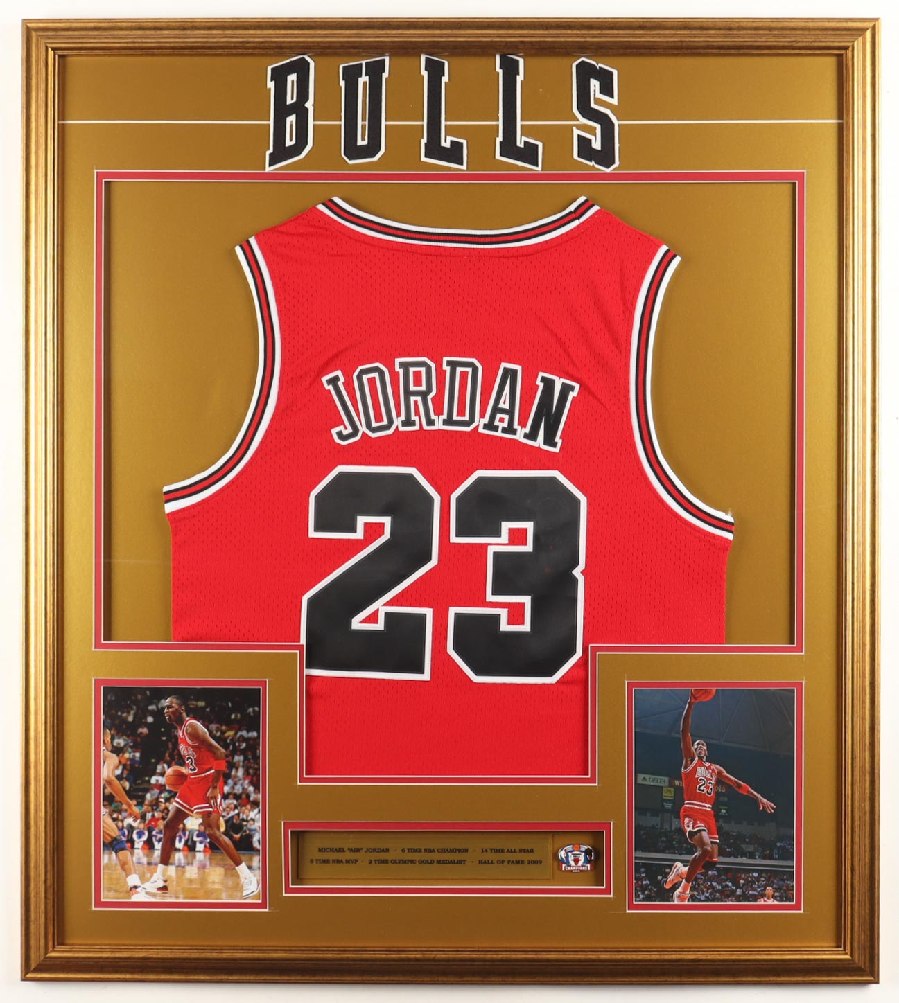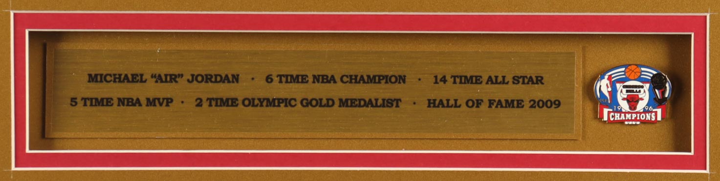 Custom frame measures approximately 33" x 37" in size and features an unsigned Michael Jordan (HOF) jersey. The display also includes (2) Photos, 1996 Champions Pin and a Career Statistics Plaque. Please note, the display is unsigned.