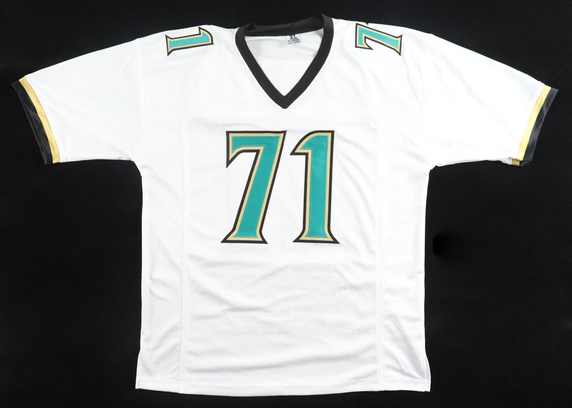 Custom jersey with everything sewn on, size XL. Hand-signed by Tony Boselli (HOF). Boselli's career highlights have been custom stitched onto the back of the jersey below the reverse numbers.