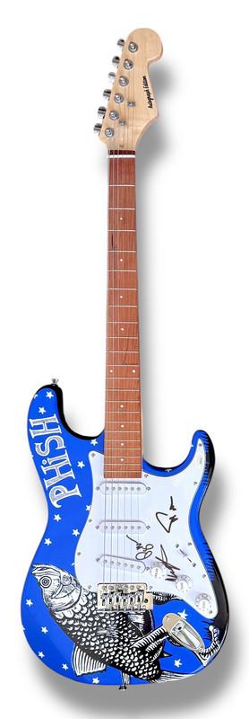 Custom Autograph Edition Stratocaster style electric guitar measures approximately 39" in length and has been hand-signed on the pickguard by Trey Anastasio (lead singer & guitarist), Page McConnell (lead keyboardist), and Mike Gordon (lead bassist).