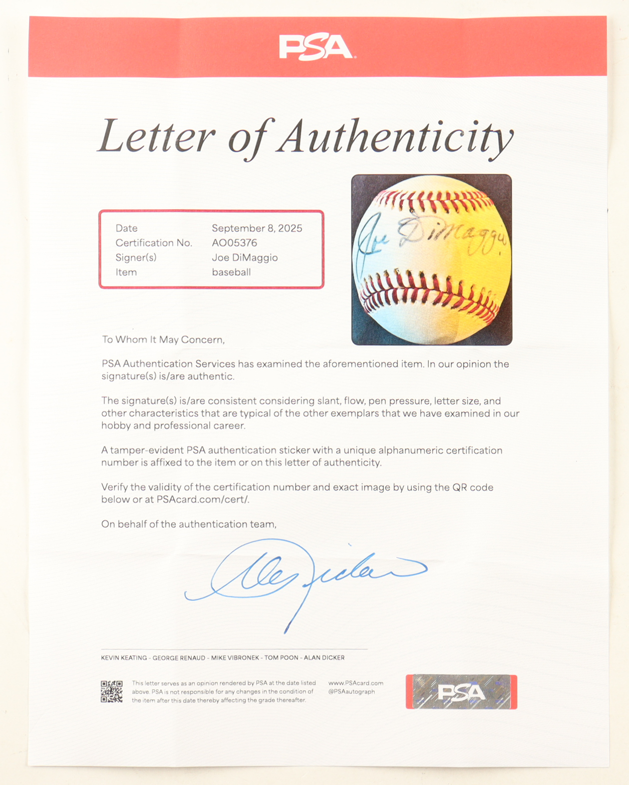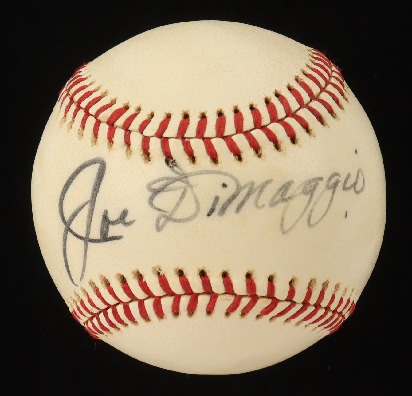 Rawlings Official American League Baseball. Hand-signed by Joe DiMaggio (D. 1999, New York Yankees, HOF). Please note, the baseball is naturally toned and stained.