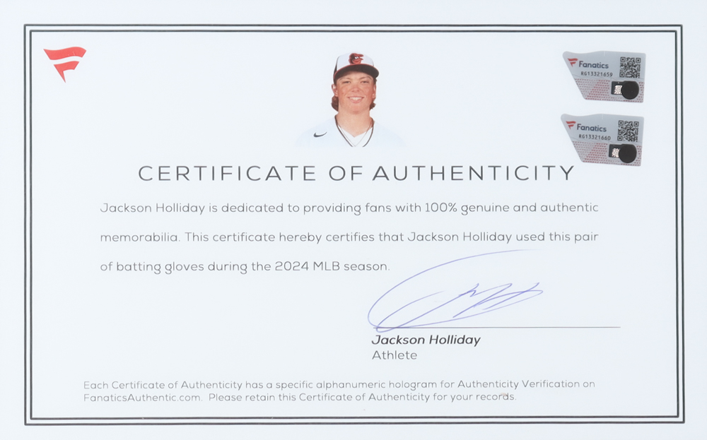 Jackson Holliday Signed Game-Used Adidas Batting Gloves (Fanatics & MLB)