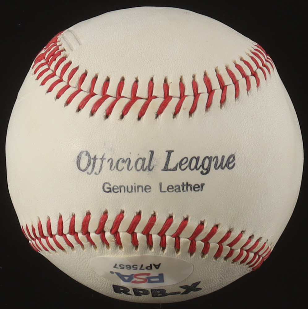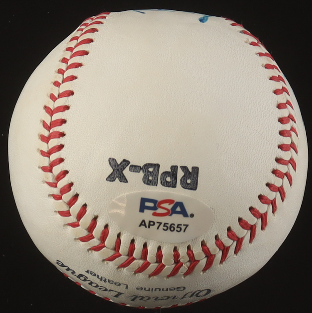 RPB-X Official League Baseball. Hand-signed and inscribed by Tug McGraw (D. 2004, Philadelphia Phillies). Please note, there are stains throughout the baseball and the inscription has been personalized "To Gena".
