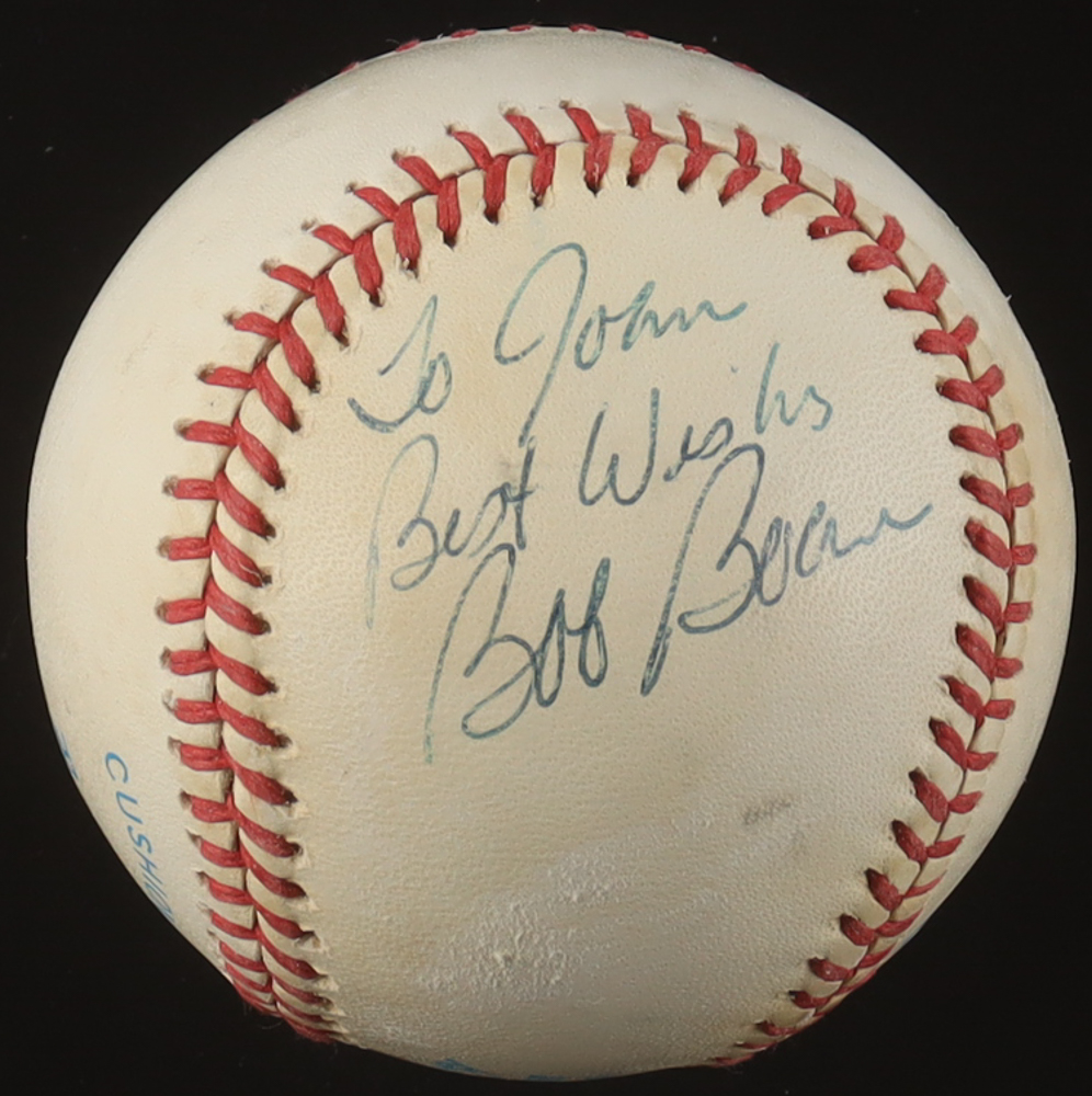 Rawlings Official American League Baseball. Hand-signed and inscribed by Bob Boone (Philadelphia Phillies). Please note, the baseball is naturally toning and stained, and the inscription has been personalized "To John".